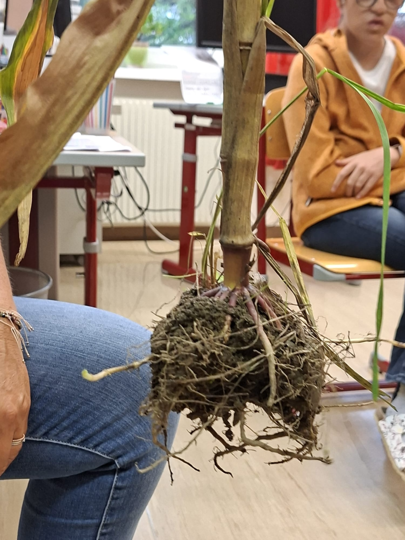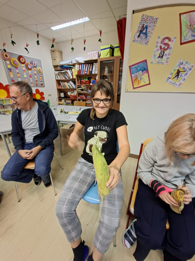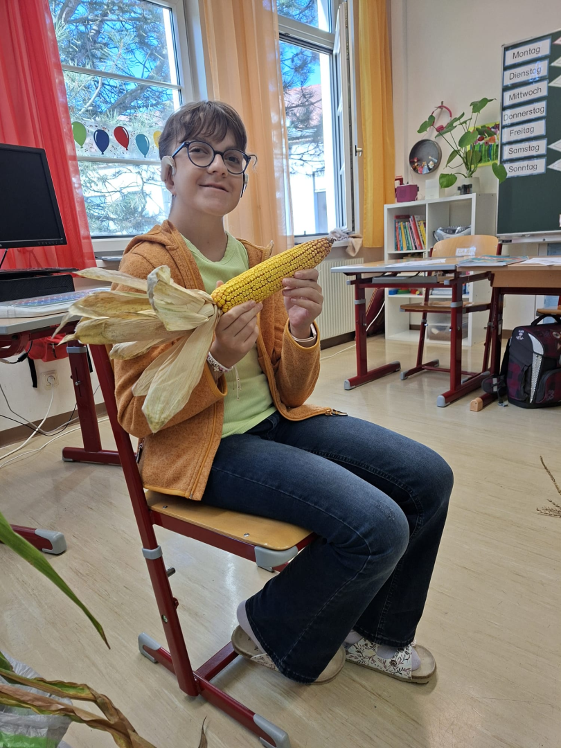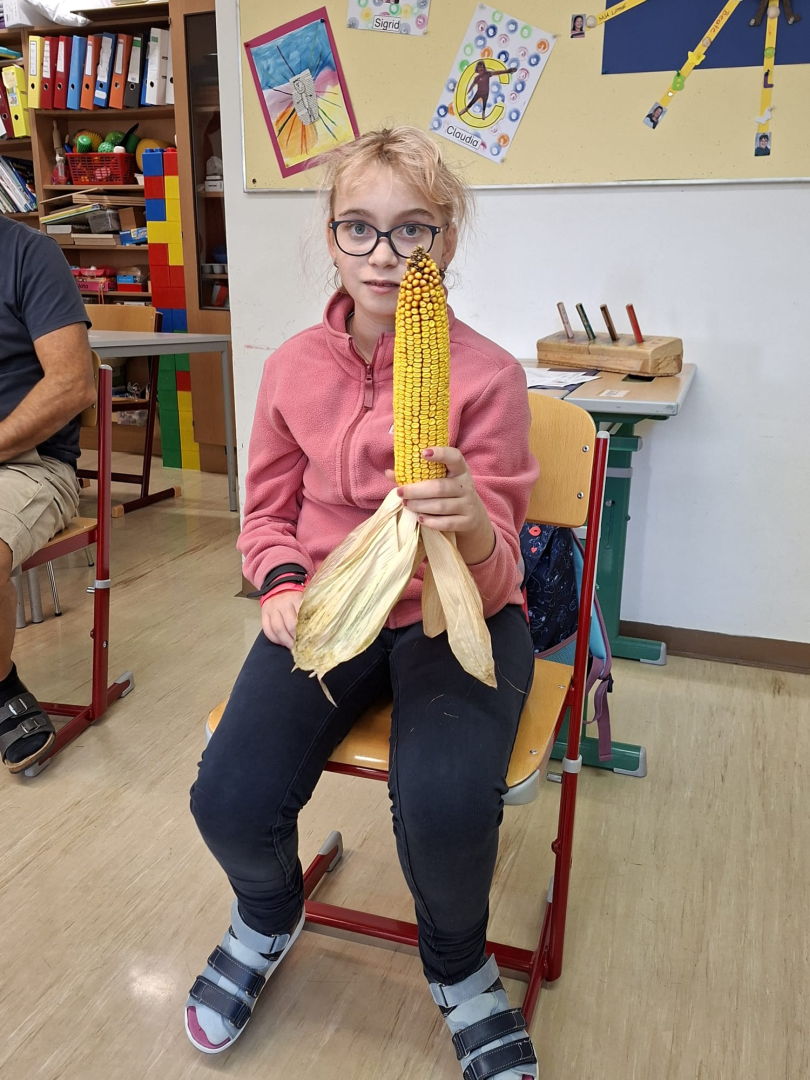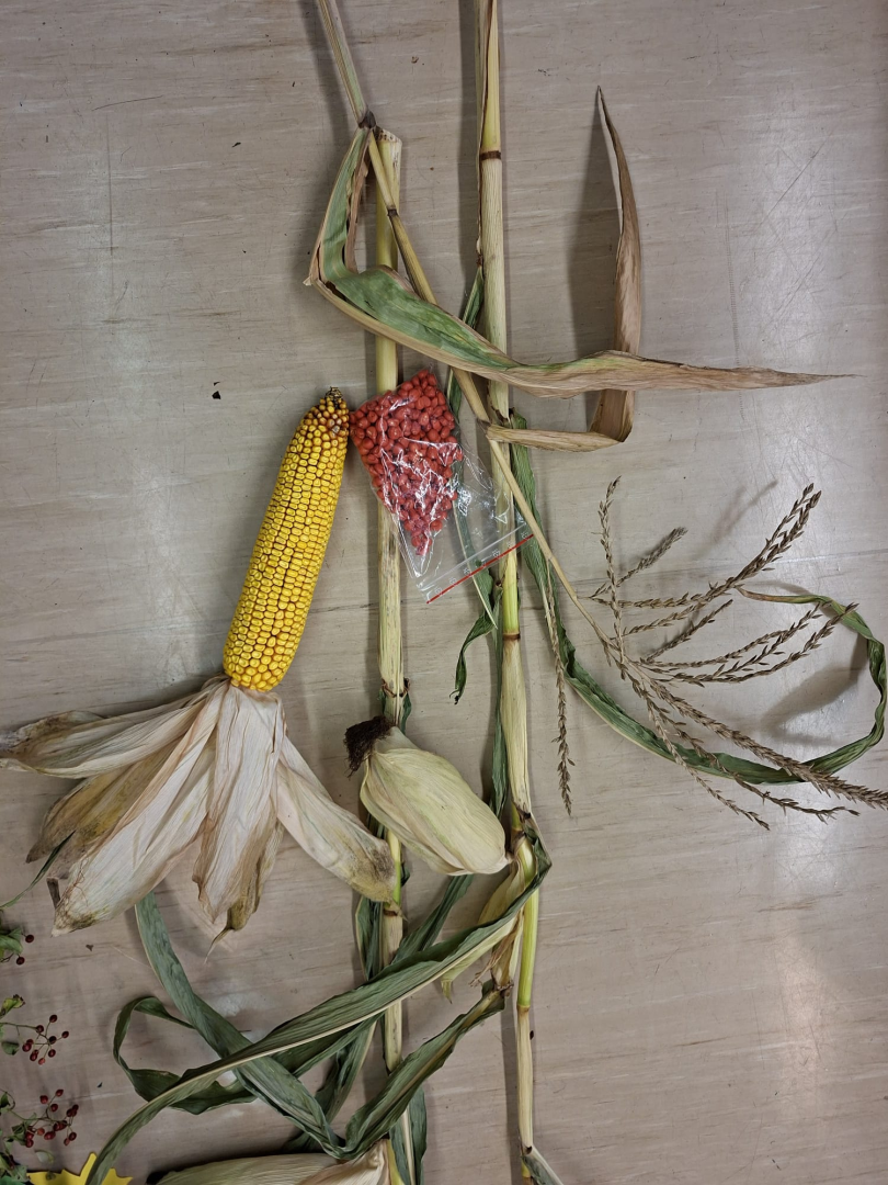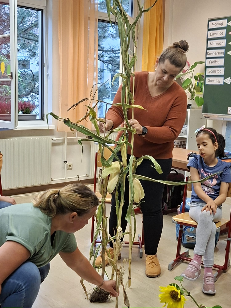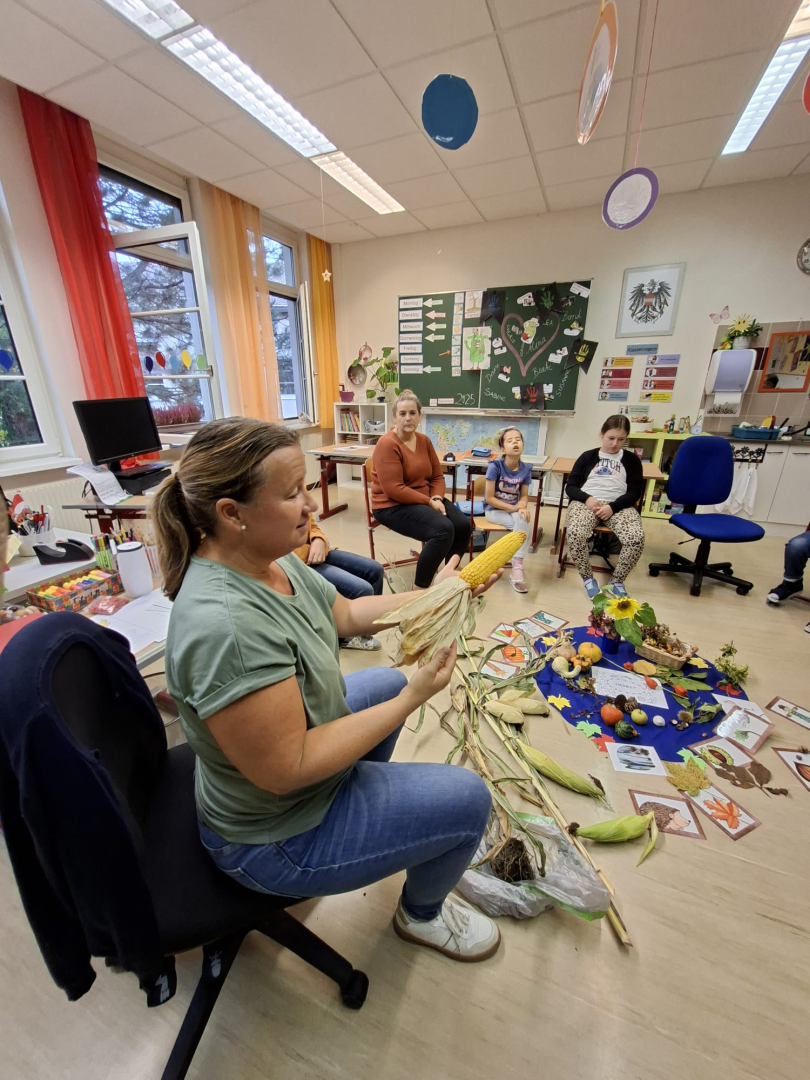 Die Kinder brachten viele bunte Herbstschätze mit, die im Kreis bewundert wurden. Besonders großes Interesse weckte die Maispflanze, die genau betrachtet und besprochen wurde.