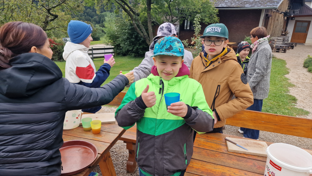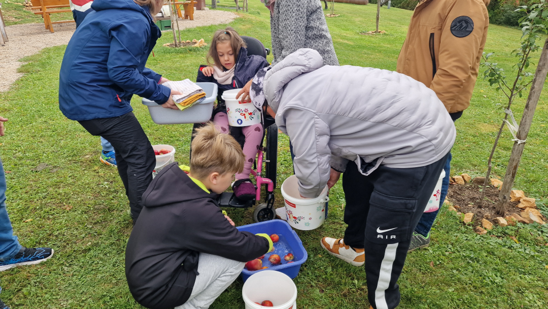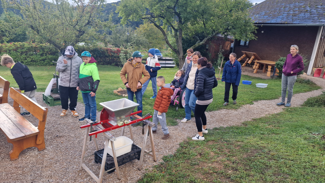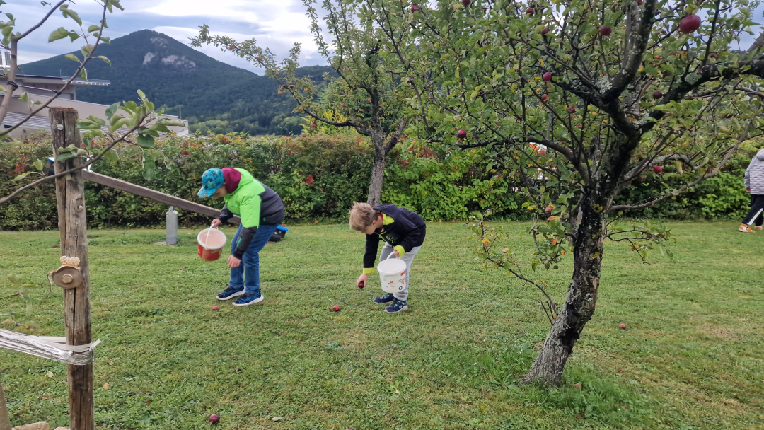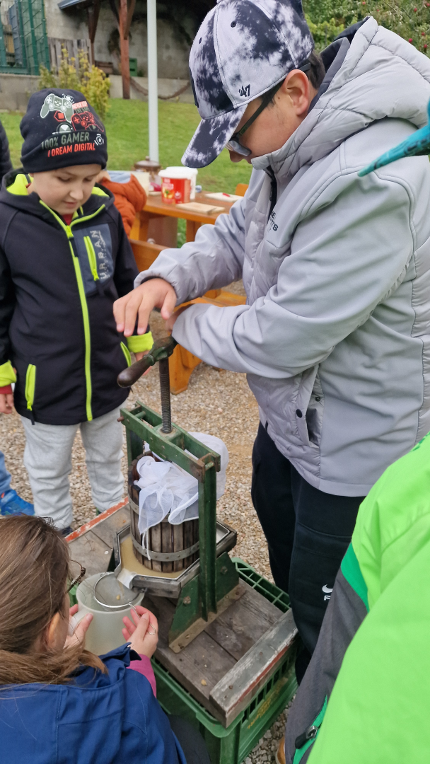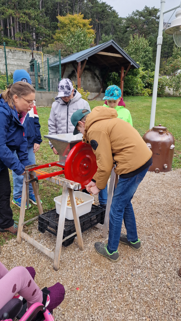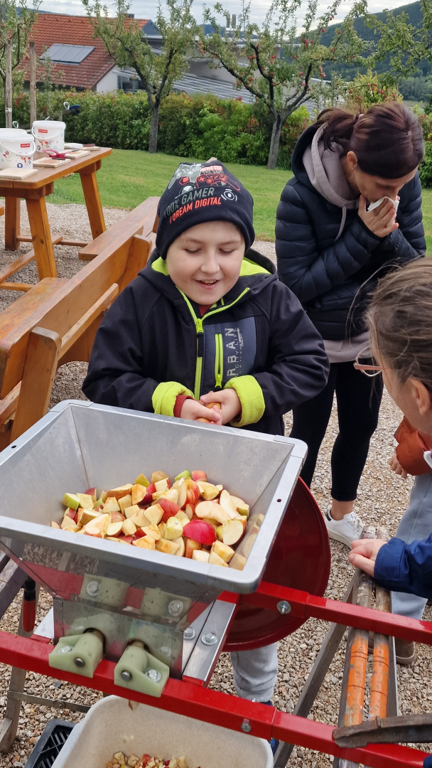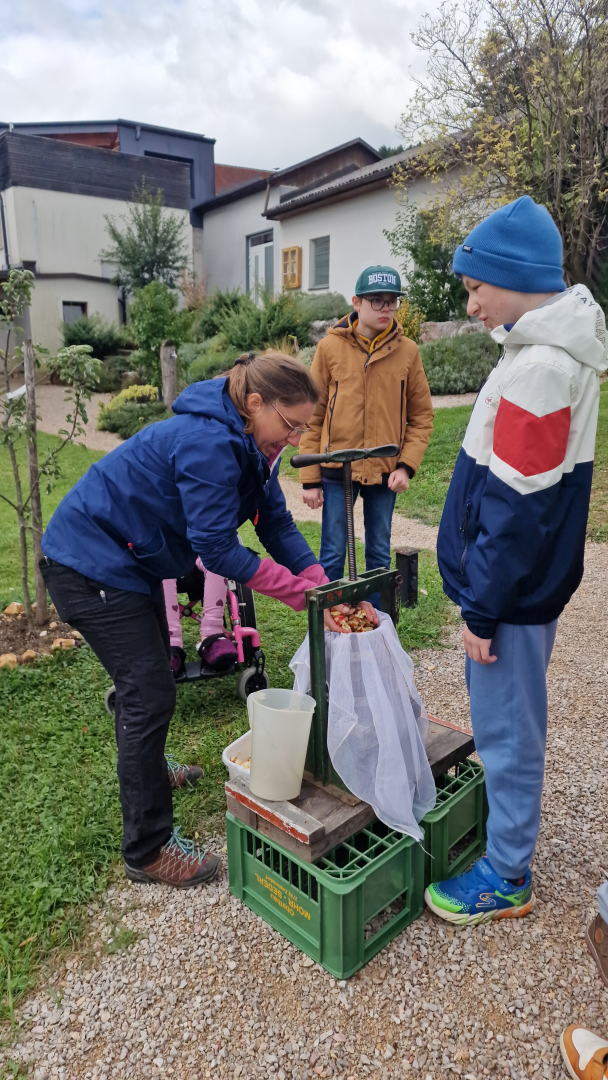 Zunächst durften wir Äpfel einsammeln, waschen und in kleine Stücke schneiden. Anschließend pressten wir mit einer Handpresse unseren eigenen Apfelsaft – die Verkostung war natürlich ein besonderes Highlight!