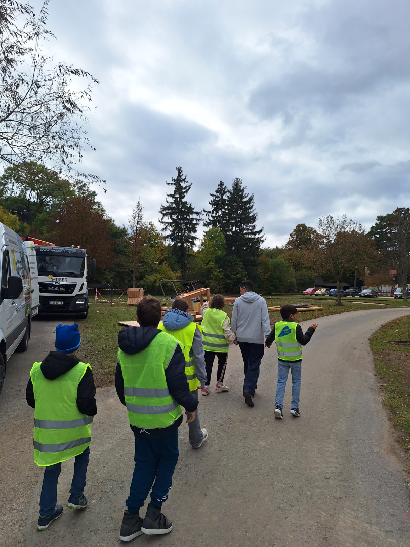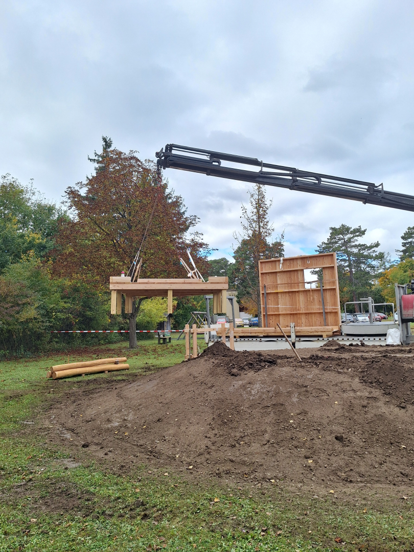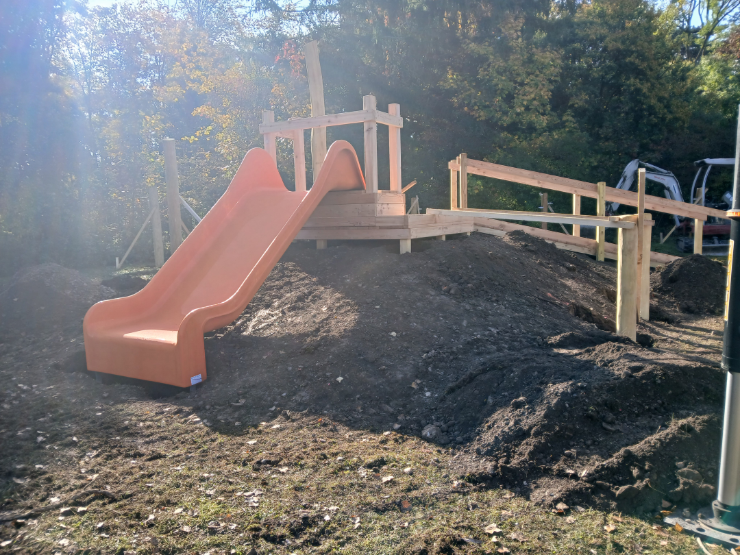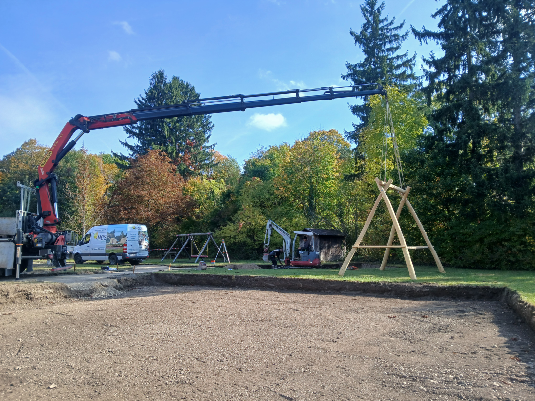 Die Arbeiten an der Baustelle fĂŒr den neuen Spielplatz machen groĂe Fortschritte. In den letzten Tagen herrschte reges Treiben: Tieflader und Lastwagen lieferten die neuen SpielgerĂ€te an!