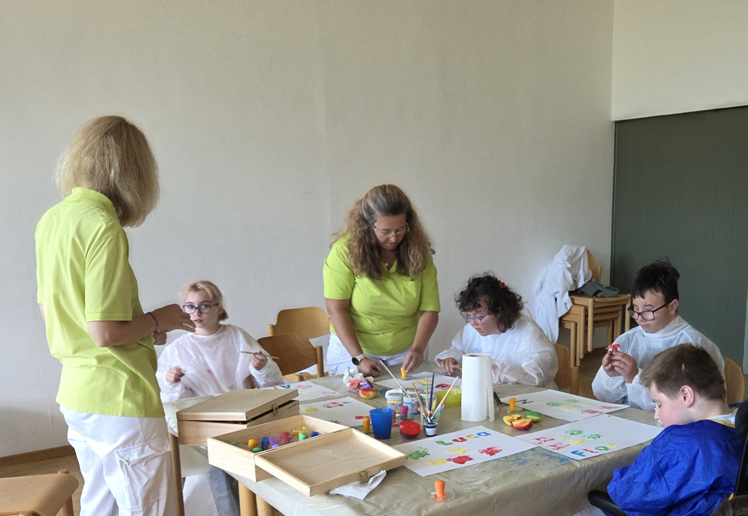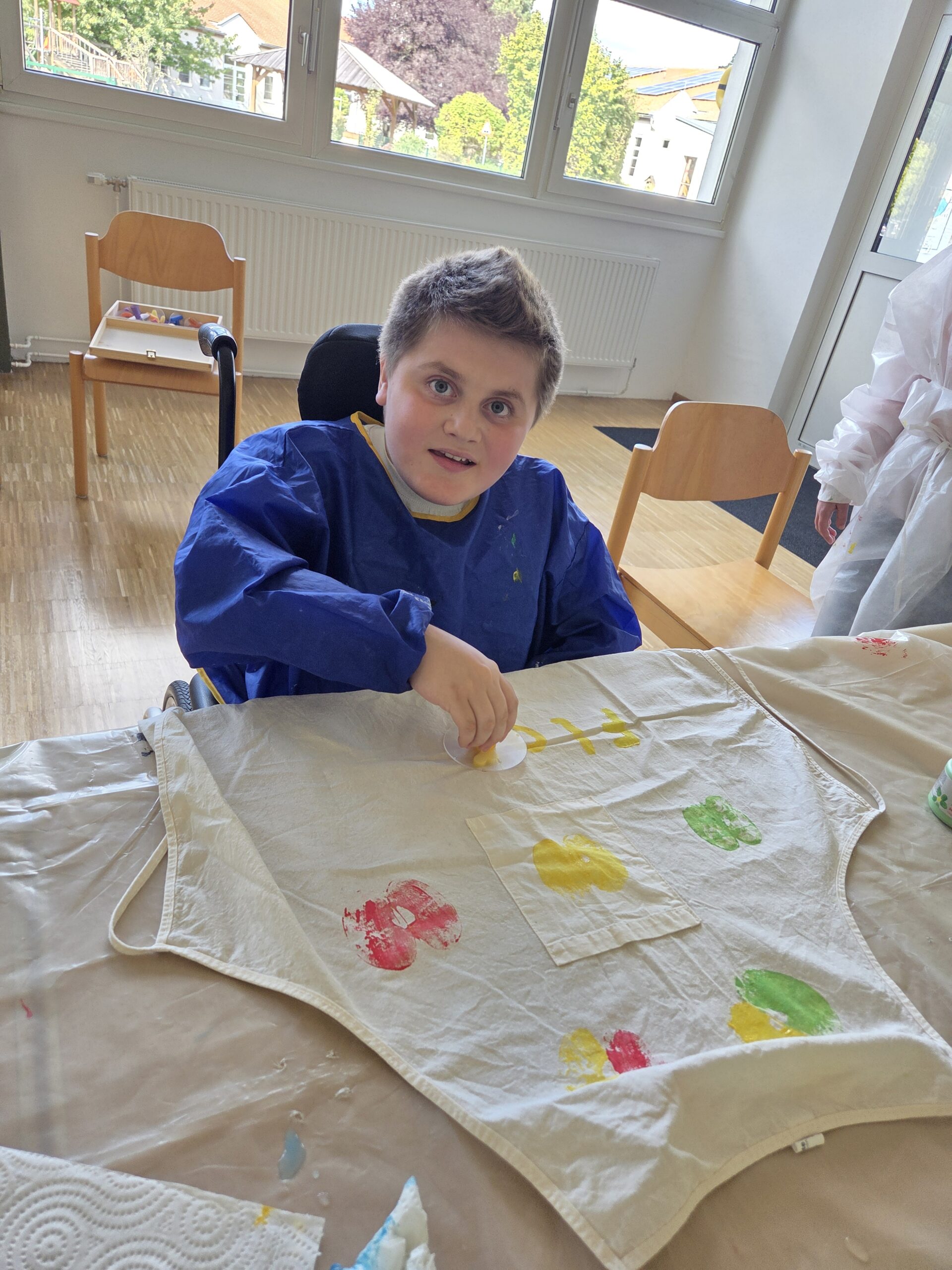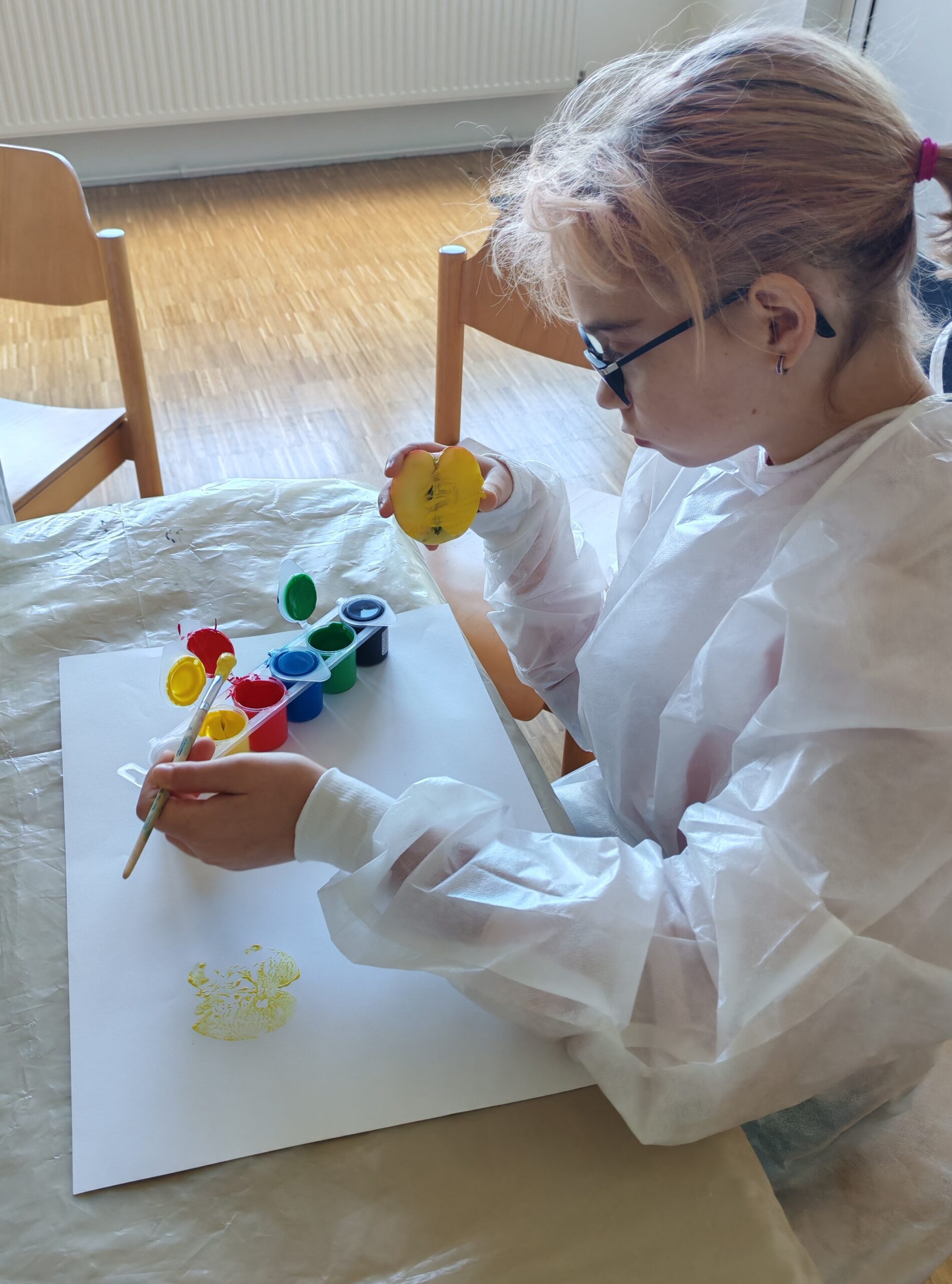 Zum Auftakt lernten die Kinder den Apfel in all seinen Facetten kennen – sie fühlten, rochen und betrachteten ihn genau. Beim anschließenden Apfeldruck entstanden mit leuchtenden Farben wunderschöne Tischsets und Schürzen. Ganz nebenbei trainierten die Kinder Feinmotorik, Konzentration und Kreativität – und erlebten, wie viel Freude im Tun steckt.