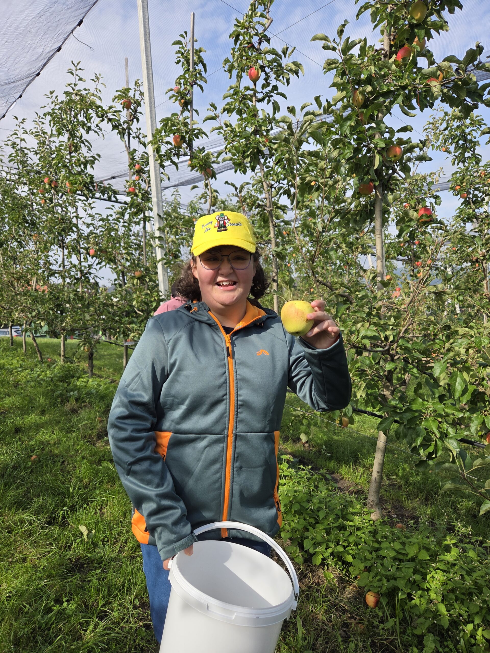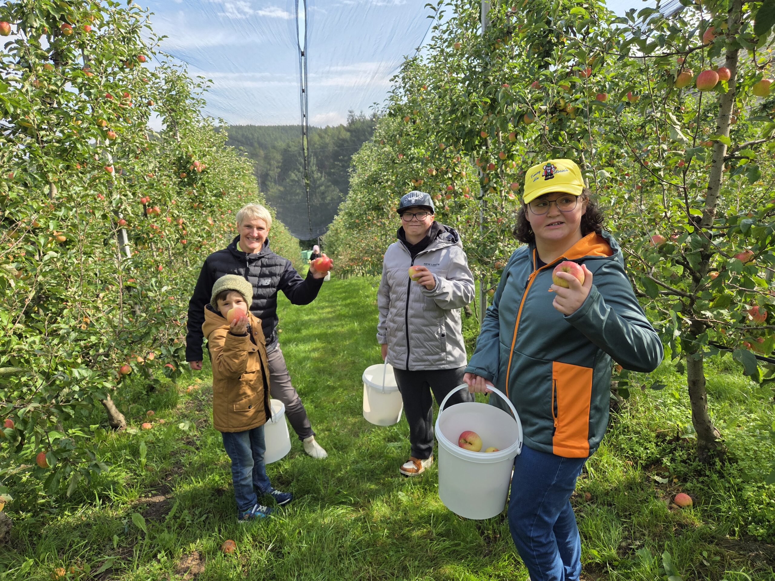Ein echtes Highlight war der Besuch einer Apfelplantage. Zwischen den Bäumen durften die Kinder selbst Äpfel pflücken, verschiedene Sorten verkosten und ihre Lieblingssorte wählen. In der frischen Herbstluft wurde gelacht, probiert und gestaunt. Der Ausflug stärkte Wahrnehmung, Selbstständigkeit und Teamgeist – und machte den Apfel zu einem Erlebnis für alle Sinne.