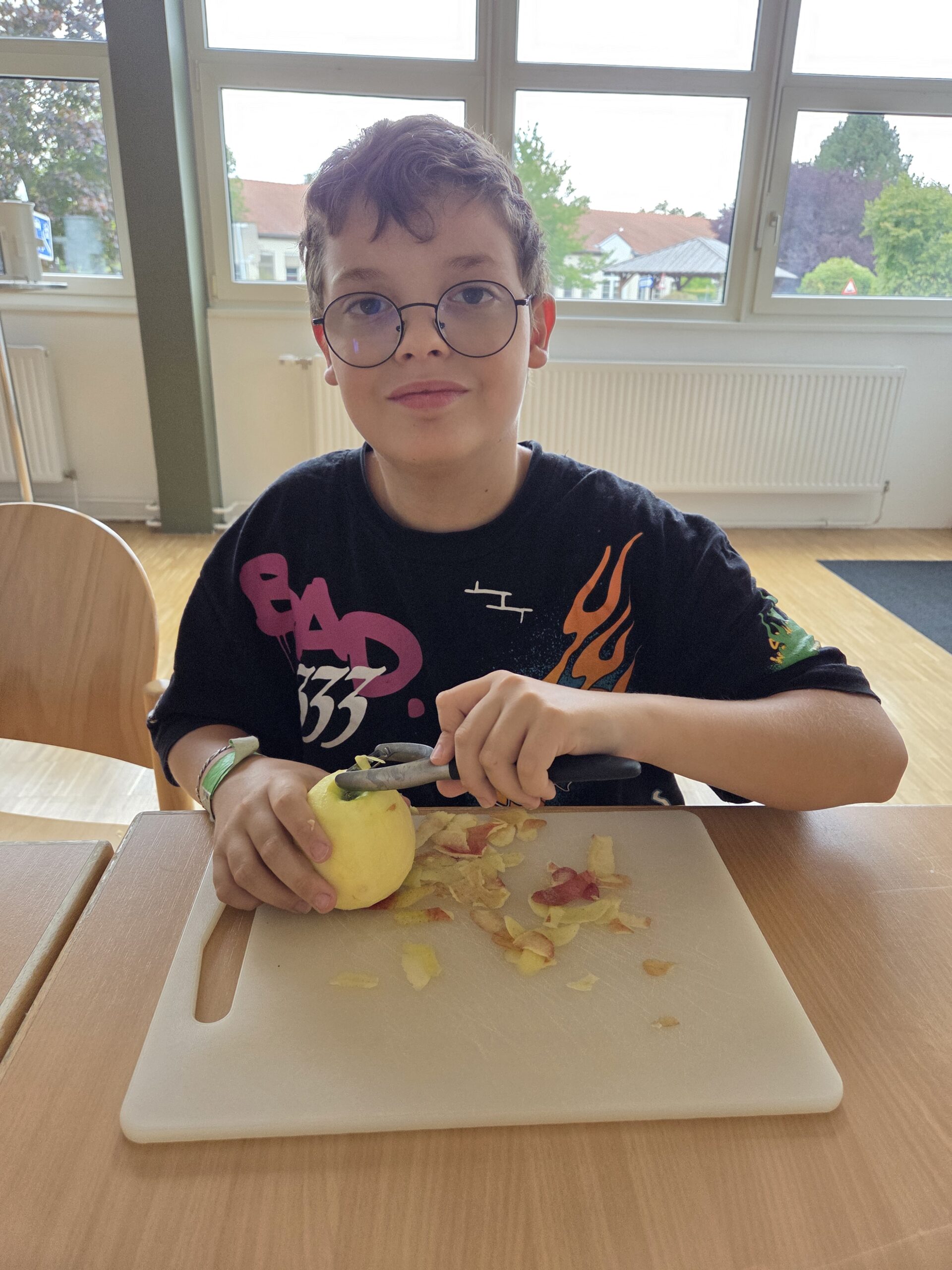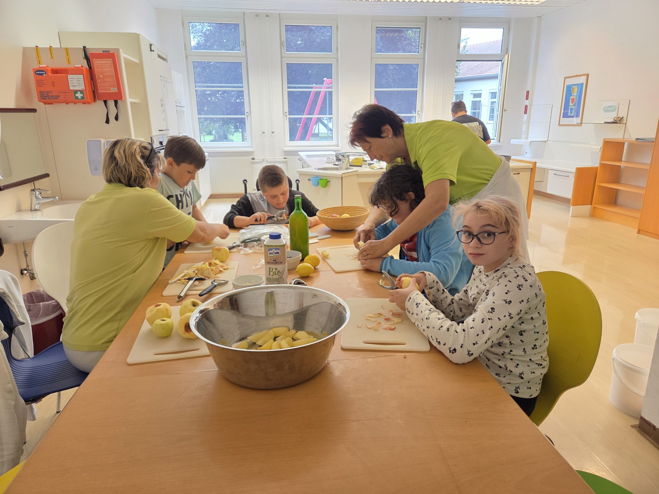 Nun wurde es köstlich: Gemeinsam verwandelten die Kinder ihre Äpfel in duftenden Apfelstrudel mit Vanillesauce. Beim Schälen, Schneiden und Füllen wurde eifrig gearbeitet – Feinmotorik, Planung und Zusammenarbeit waren gefragt. Das gemeinsame Essen danach war ein besonderer Moment: stolz, zufrieden und richtig lecker!