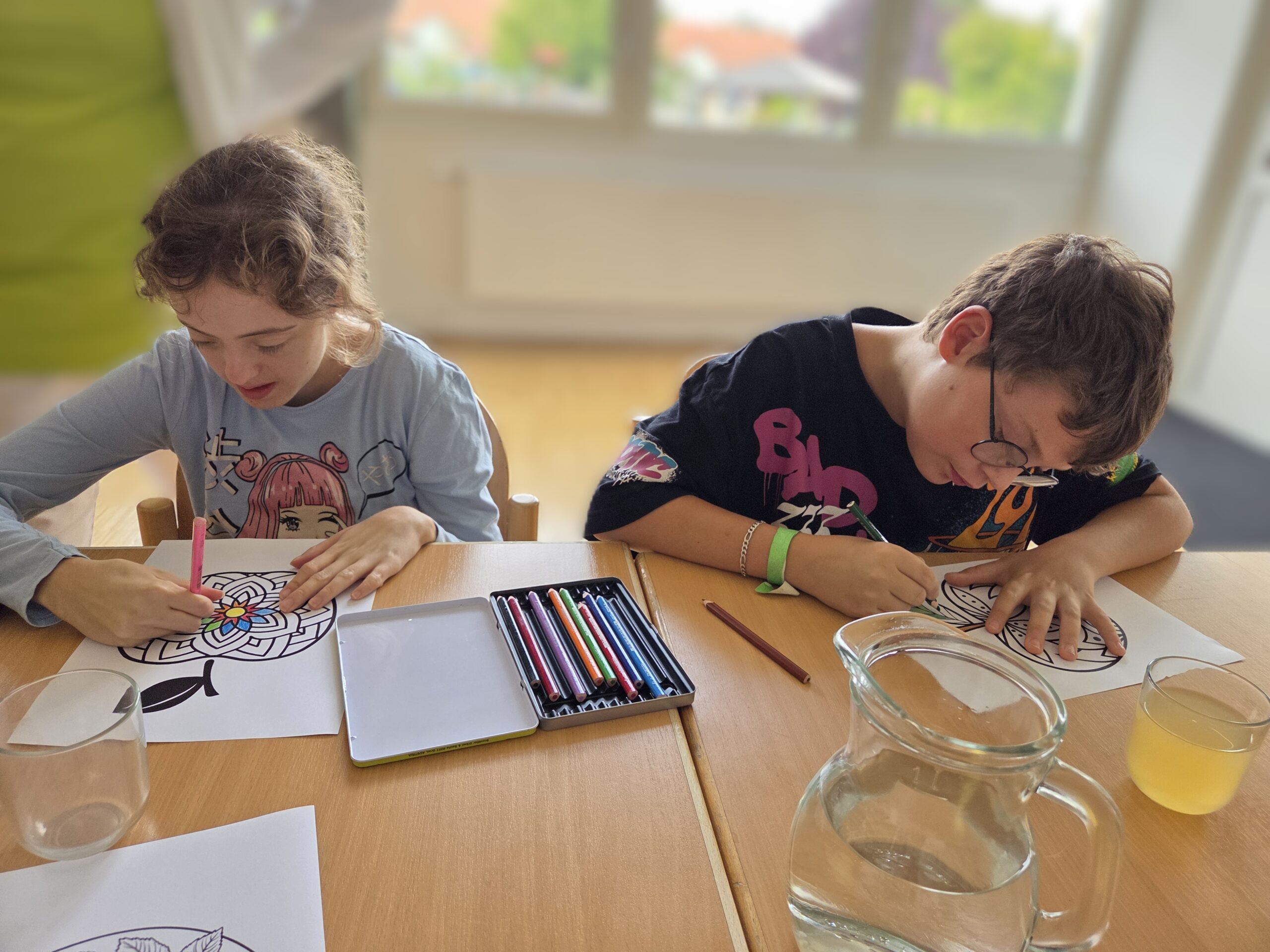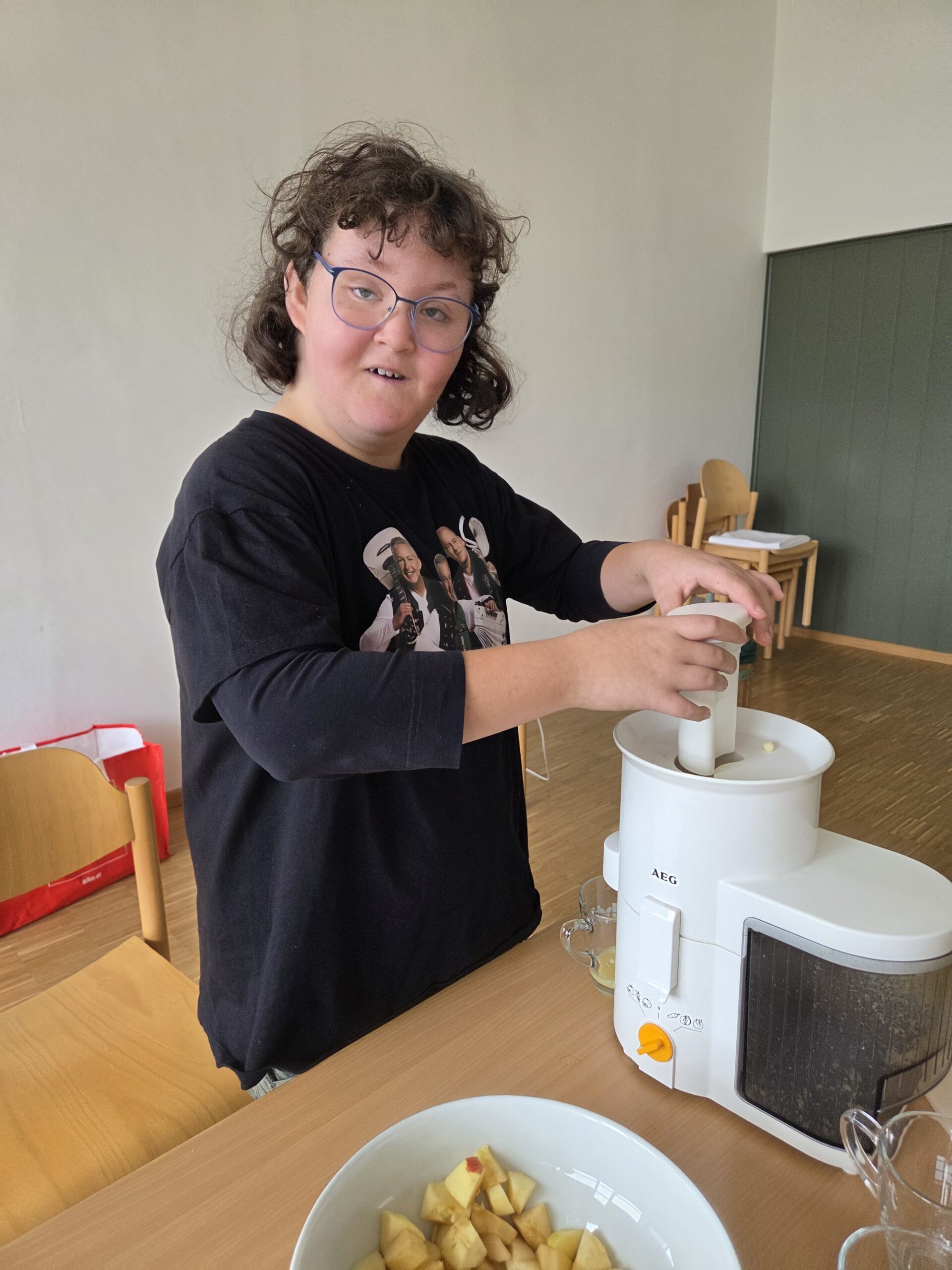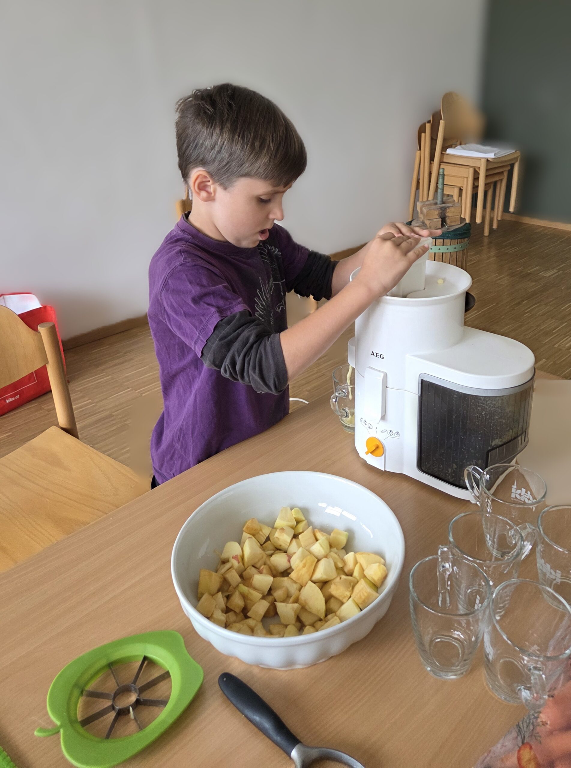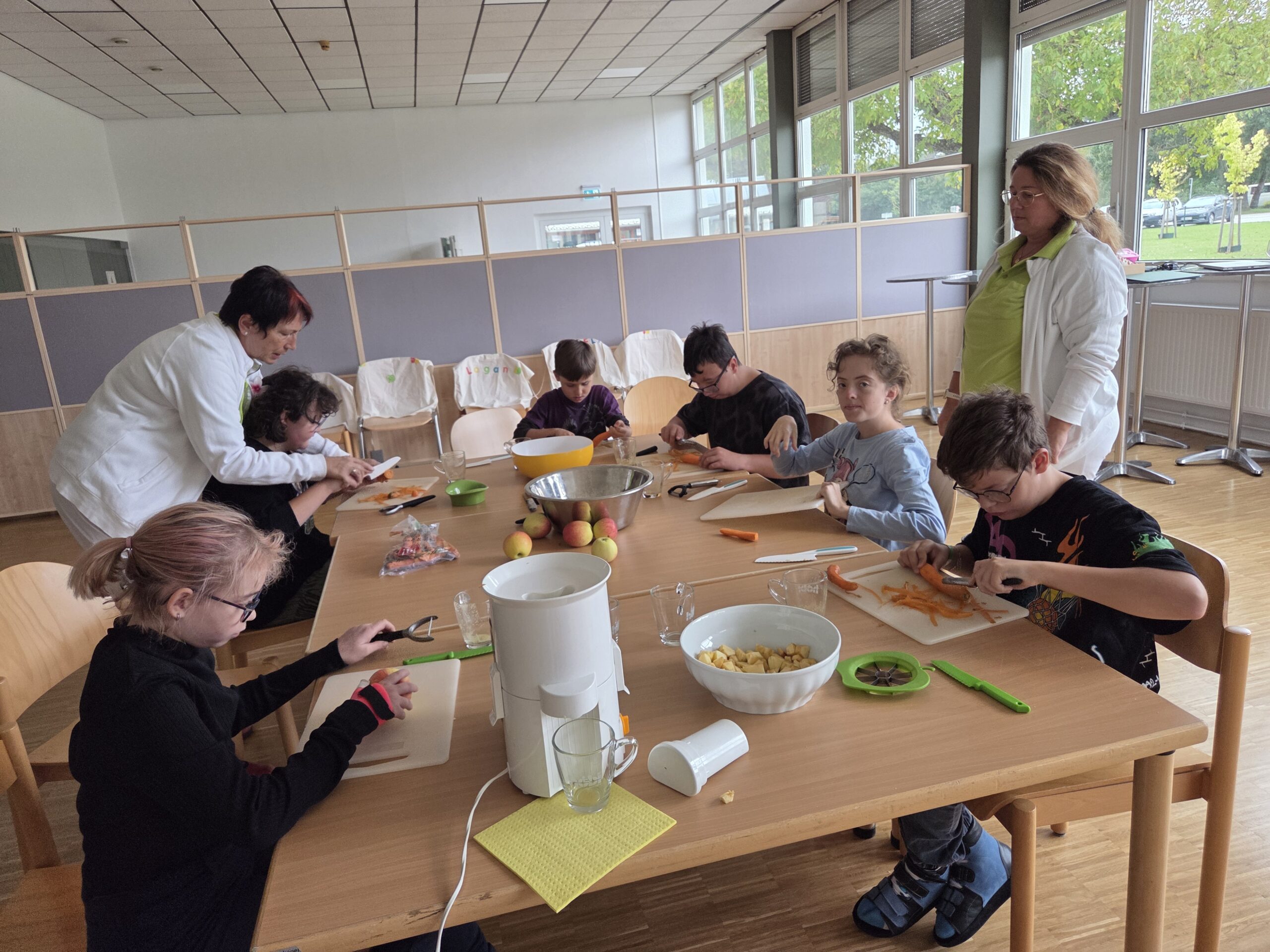 Am letzten Tag wurde experimentiert: Aus Äpfeln und Karotten entstanden frische, bunte Säfte. Mit viel Begeisterung mischten und kosteten die Kinder ihre eigenen Kreationen. Zum Abschluss gestalteten sie ein farbenfrohes Apfelmandala – ein Symbol für Zusammenhalt und Kreativität.