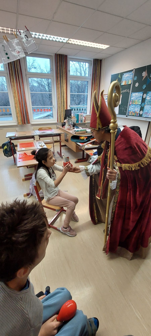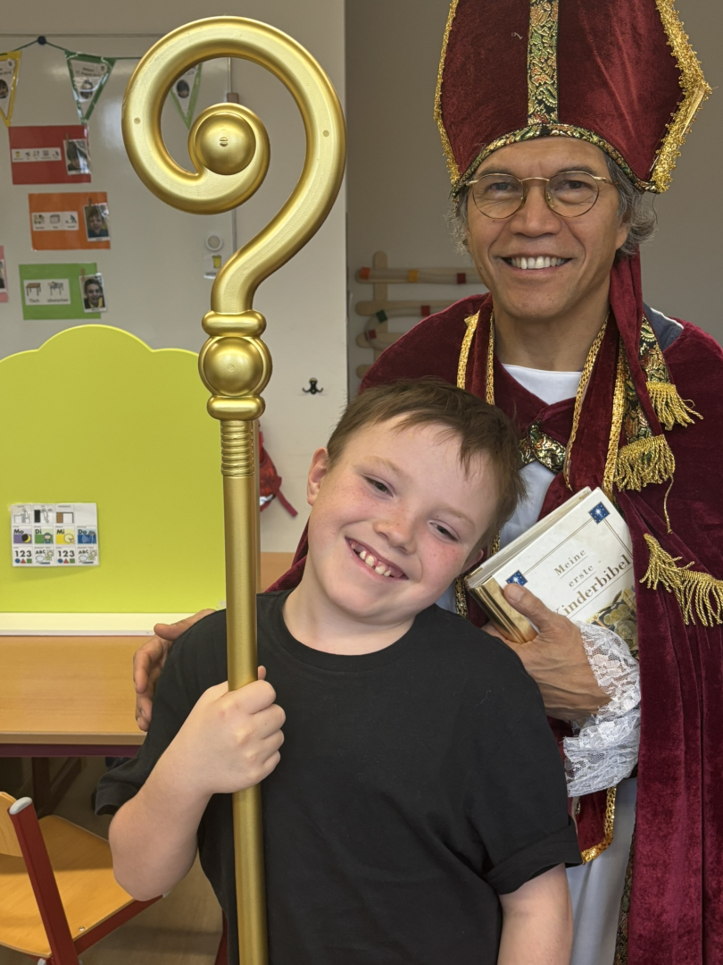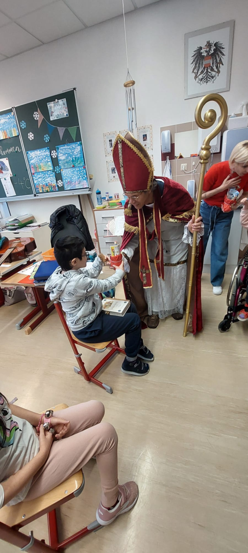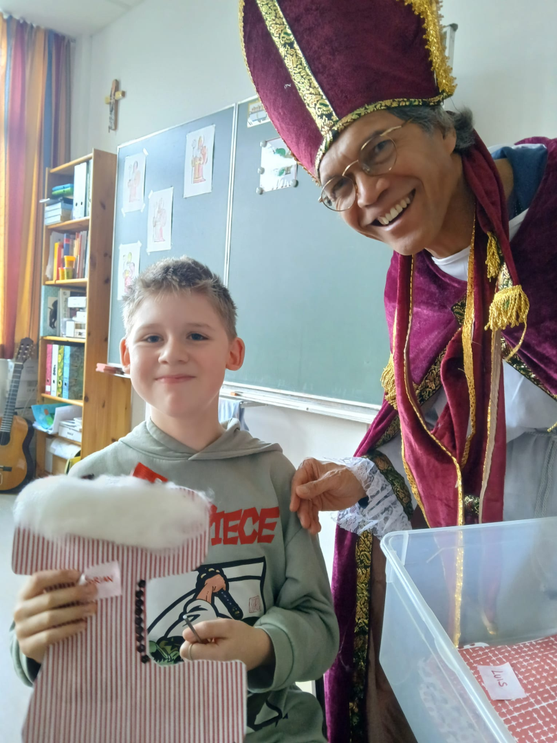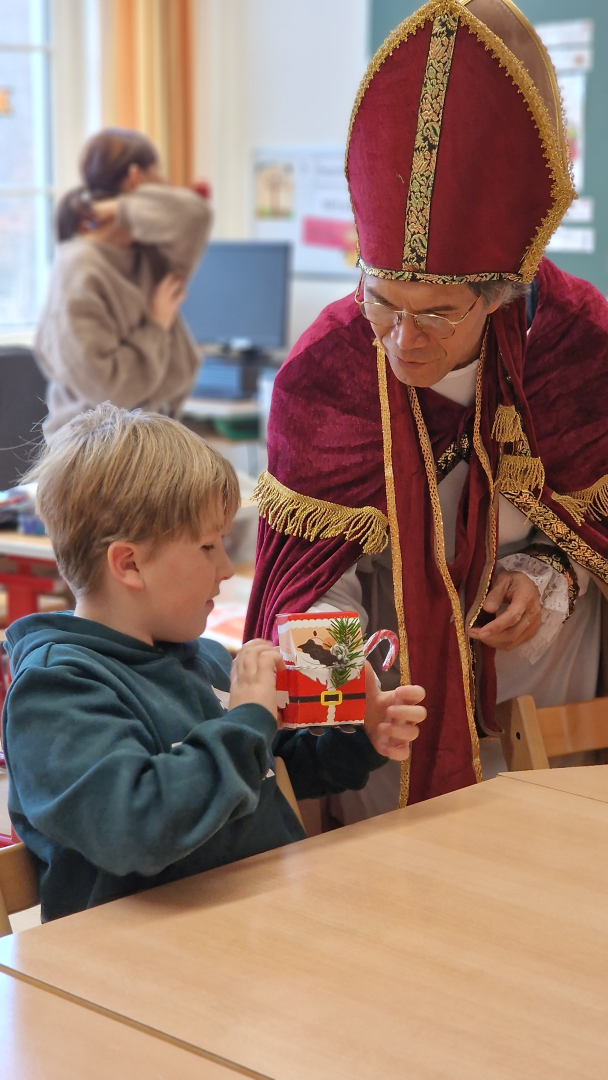 Anfang Dezember war es wieder so weit: Der Heilige Nikolaus besuchte alle Klassen der Waldschule. Schon beim ersten Klopfen an der Tür wurden die Kinder ganz still – und als der Nikolaus eintrat, leuchteten überall große, staunende Augen.