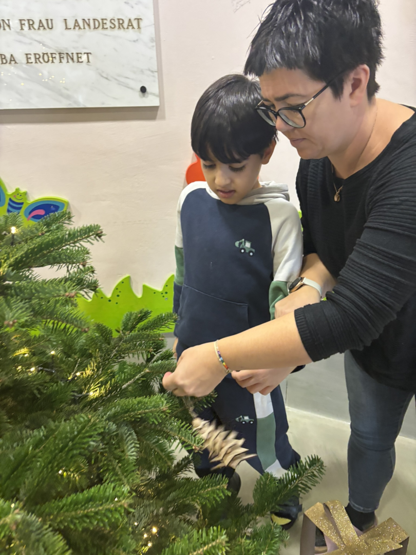 Jede Klasse übernimmt reihum das Schmücken des Baumes. Mit viel Liebe entstehen Sterne, Herzen, Zapfen, kleine Figuren und andere schöne Ornamente aus Papier, Stoff oder Naturmaterialien.