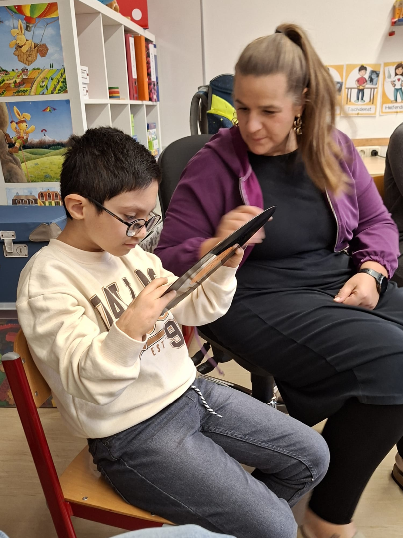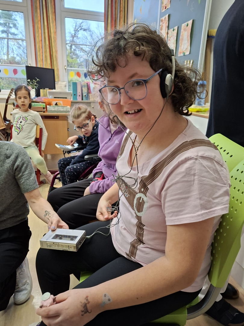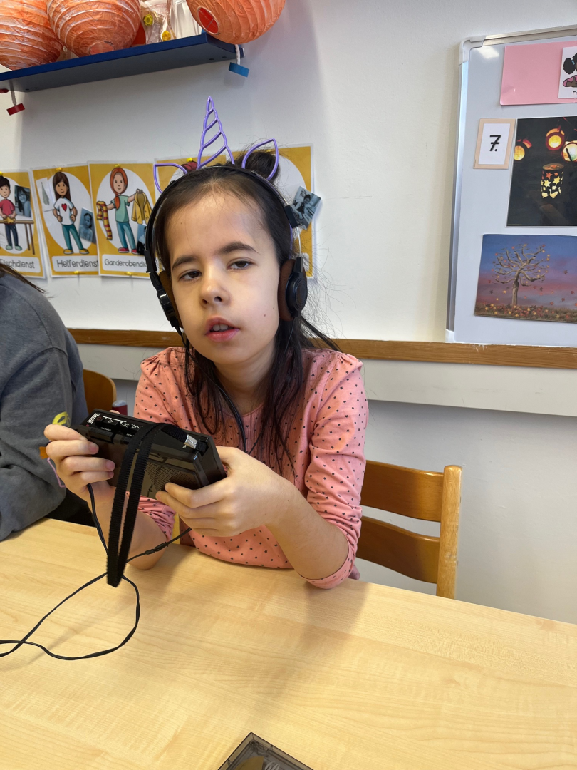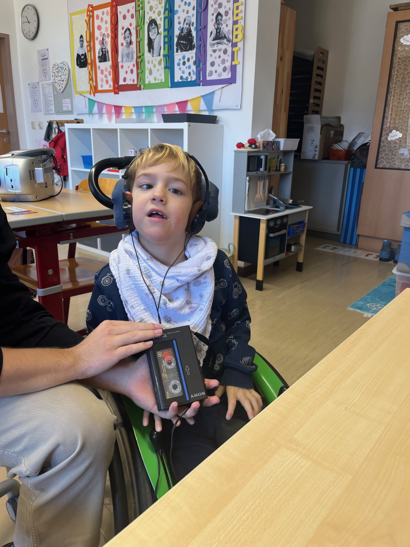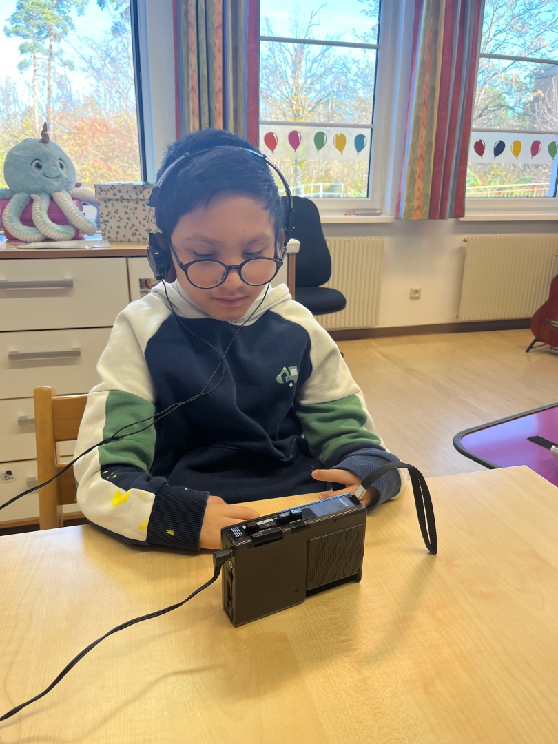 Zu Beginn erkundeten die Kinder die Musikwelt vergangener Zeiten. Sie gingen der Frage nach, wie früher Musik gehört wurde, und lernten dabei unterschiedliche Geräte kennen: vom Grammophon über den Plattenspieler, den Kassettenrekorder, Walkman und Discman bis hin zur CD und dem CD-Player. Auch der MP3-Player wurde vorgestellt. Viele Geräte durften die Schülerinnen und Schüler selbst ausprobieren – das war spannend und machte allen großen Spaß. Anschließend wurde gemeinsam besprochen, wie Musik heute meist über das Handy gehört wird.