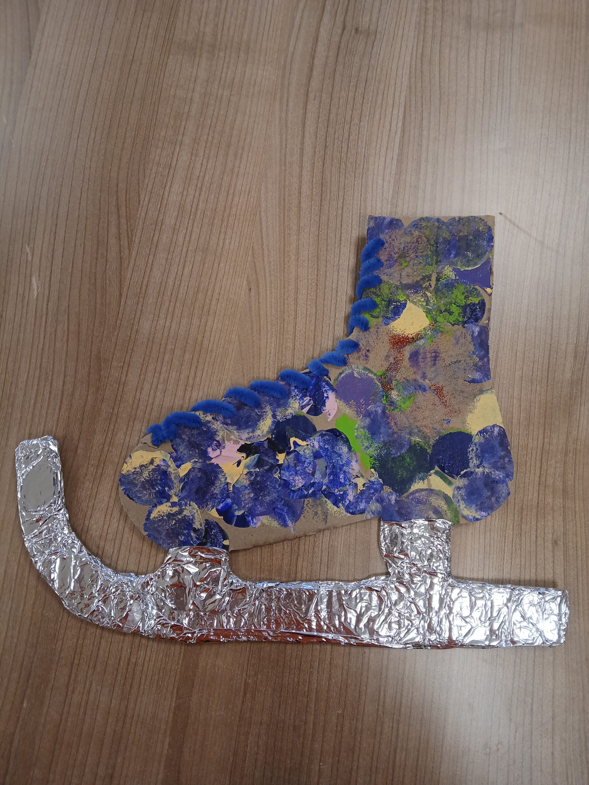 Als besonderes Highlight war die glänzende Alufolie, die die Kufen der Eislaufschuhe authentisch machten und den Schuhen einen winterlichen Glanz verliehen. Beim Einfädeln der Pfeifenputzer als Schuhbänder war außerdem die Feinmotorik gefragt: Konzentriert und mit viel Geduld meisterten die Kinder diese Aufgabe.