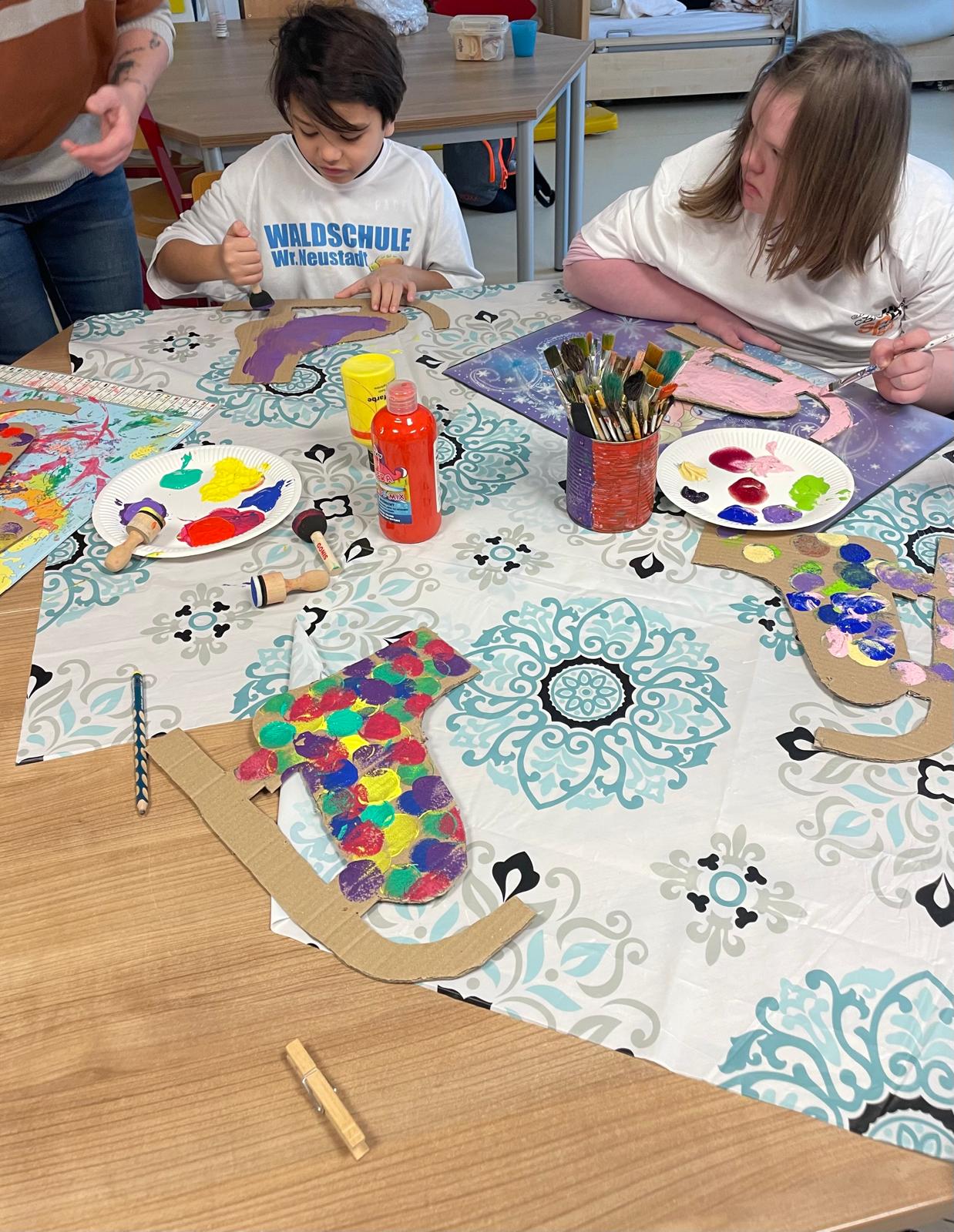 Passend zum winterlichen Wetter wurde in der Ferienbetreuung eine kreative Bastelarbeit angeboten. Mit viel Freude gestalteten die Kinder kunstvolle Eislaufschuhe, die mit Farben verziert wurden. Jedes Werk war einzigartig und zeigte die Fantasie und Kreativität der kleinen Künstlerinnen und Künstler.