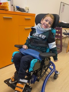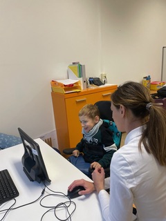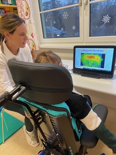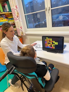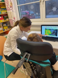 In Zusammenarbeit mit unserer Physiotherapie-Praktikantin Theresa Nussthaler wurde in täglichen, spielerisch gestalteten Trainingseinheiten an der optimalen Sitzposition gearbeitet, die für die Steuerung eines Spezial-PCs mit Augensteuerung erforderlich ist. Der Fokus lag dabei auf der Stabilisierung der Beine und des Rumpfes, um eine sichere Kopfkontrolle zu ermöglichen.