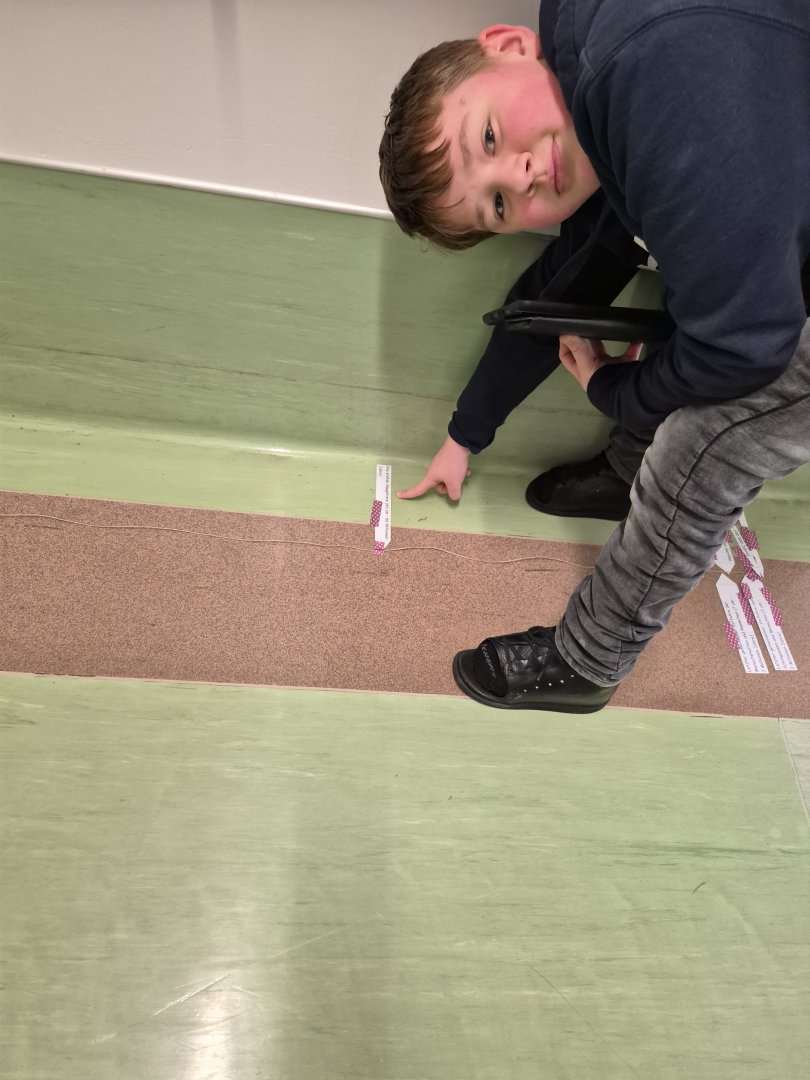 Ein besonderes Highlight war unsere „Zeitschnur“. Gemeinsam legten die Kinder eine 50m lange Schnur im Schulhaus aus, die die gesamte Erdgeschichte darstellte. Anschließend wurden wichtige Ereignisse an der passenden Stelle markiert: die Entstehung der Erde, die ersten Lebewesen im Wasser, die Zeit der Dinosaurier und schließlich das Auftreten des Menschen und viele mehr.