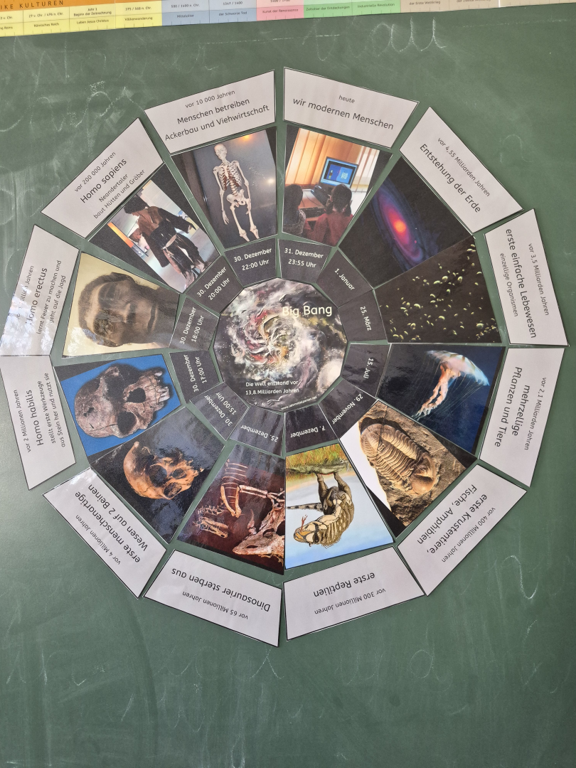 Dabei machten die Kinder eine spannende Entdeckung: Am Anfang der Erdgeschichte lagen die Ereignisse unglaublich weit auseinander. Zwischen der Entstehung der Erde und dem ersten Leben verging eine unvorstellbar lange Zeit. Je näher wir jedoch der Gegenwart kamen, desto enger rückten die Ereignisse zusammen. Besonders staunten die Schülerinnen und Schüler darüber, wie „kurz“ es her ist, dass es überhaupt Leben auf der Erde gibt – und wie winzig der Abschnitt ist, in dem es uns Menschen gibt.