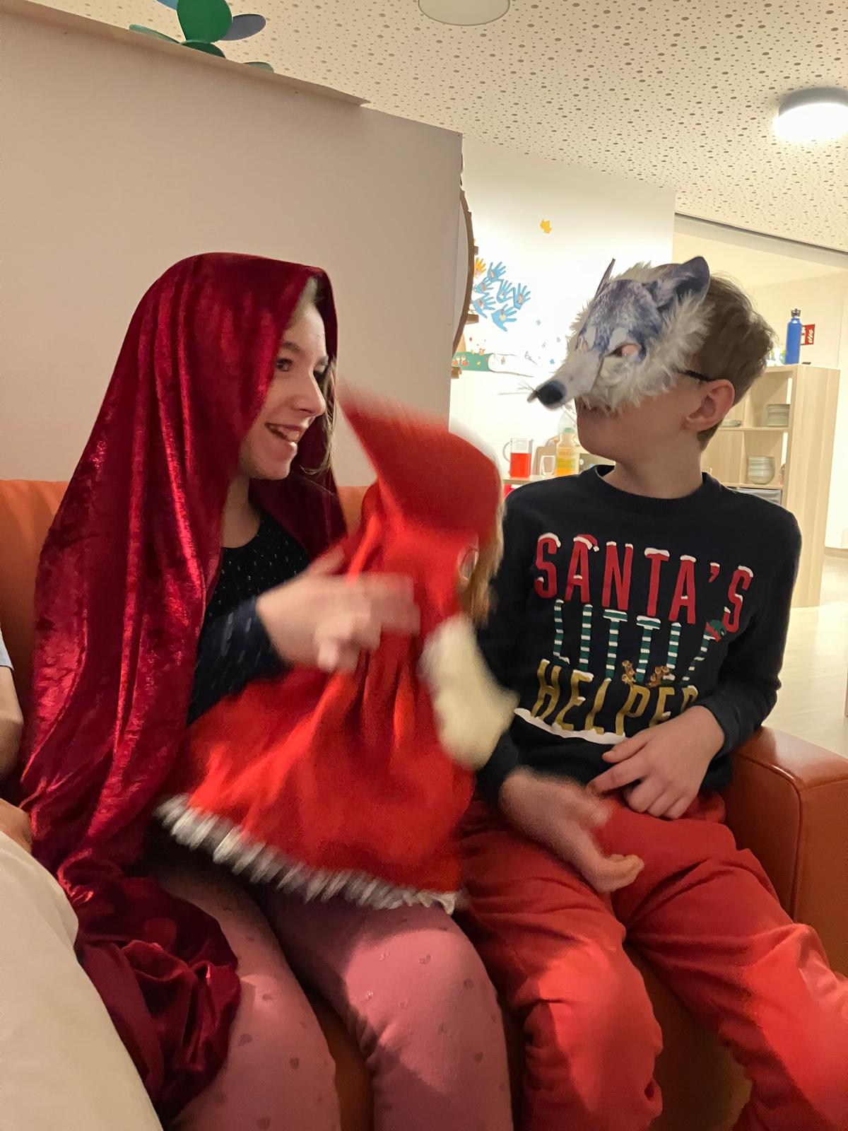 Im November und Dezember war alles ROT im Internat. In unserem Märchenkoffer befand sich diesmal die Geschichte vom „Rotkäppchen“. Nach dem Vorlesen, Bildkarten sortieren und Puppenspiel, durften alle Kinder in die verschiedensten Rollen der Märchenfiguren schlüpfen. Dabei entstanden viele kreative Spielszenen, in denen Rotkäppchen, der Wolf und die Großmutter lebendig wurden. Mit viel Freude und Fantasie tauchten die Kinder gemeinsam in die Welt des Märchens ein.