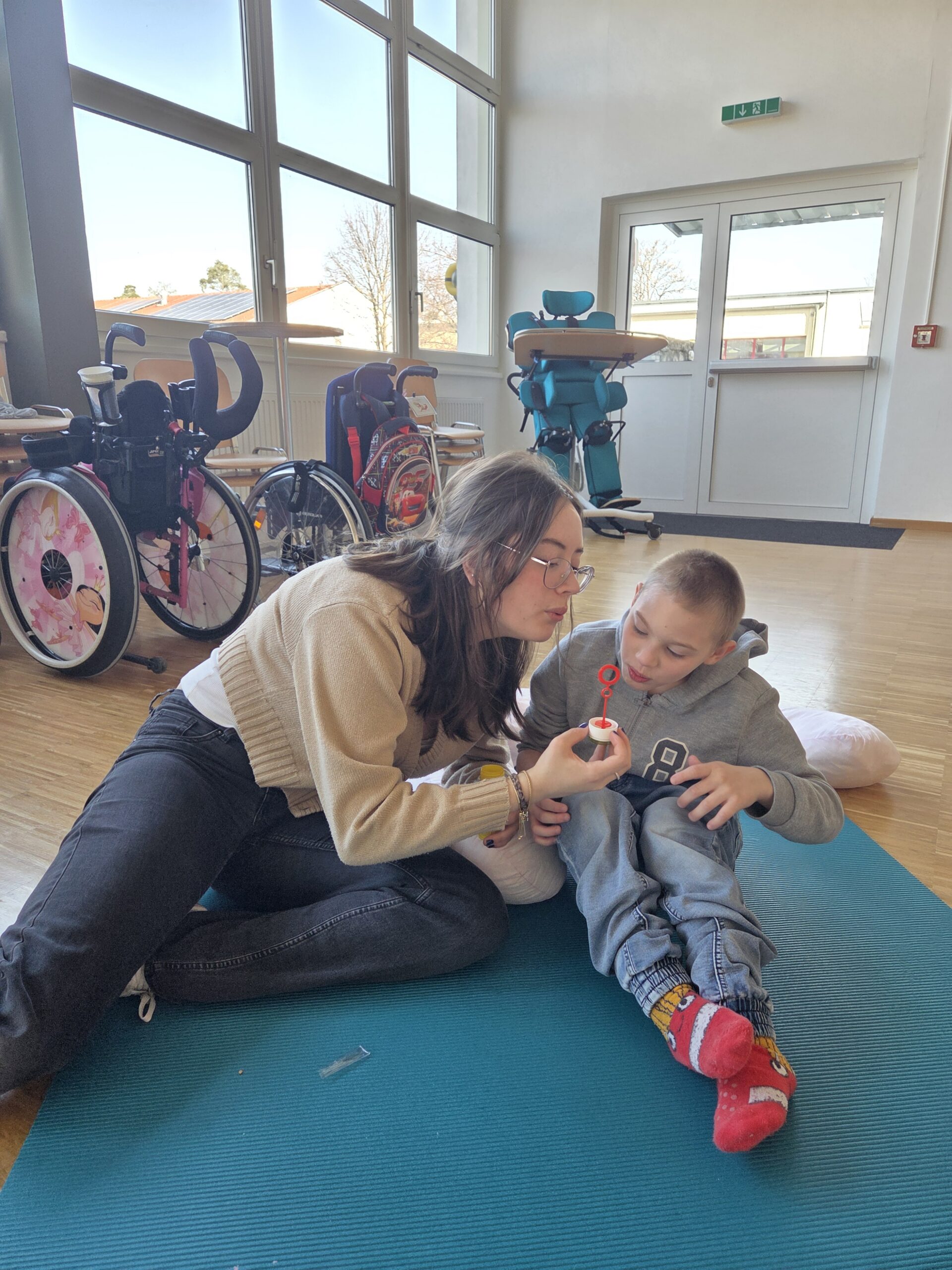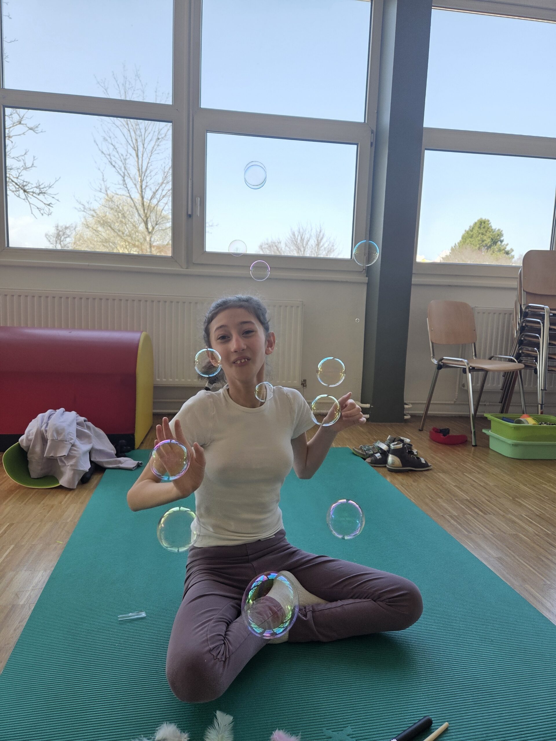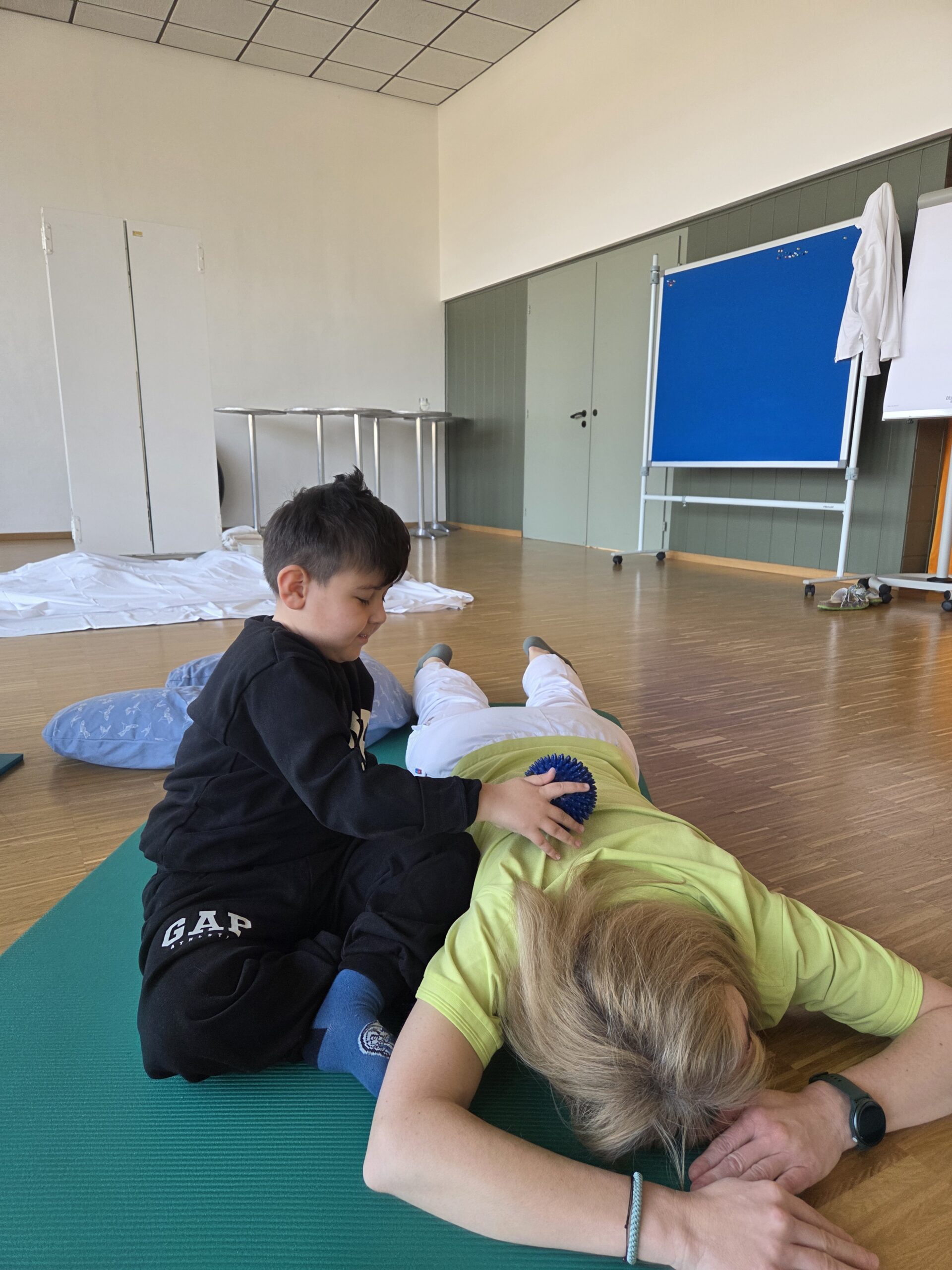 Ein besonders ruhiger und gemeinsamer Moment entstand bei der Massagegeschichte „Ostereier färben“. Mit Federn, Pinseln, Seifenblasen sowie Creme oder Öl wurden sanfte Berührungen erlebt, die Körperwahrnehmung und Entspannung gleichermaßen förderten.