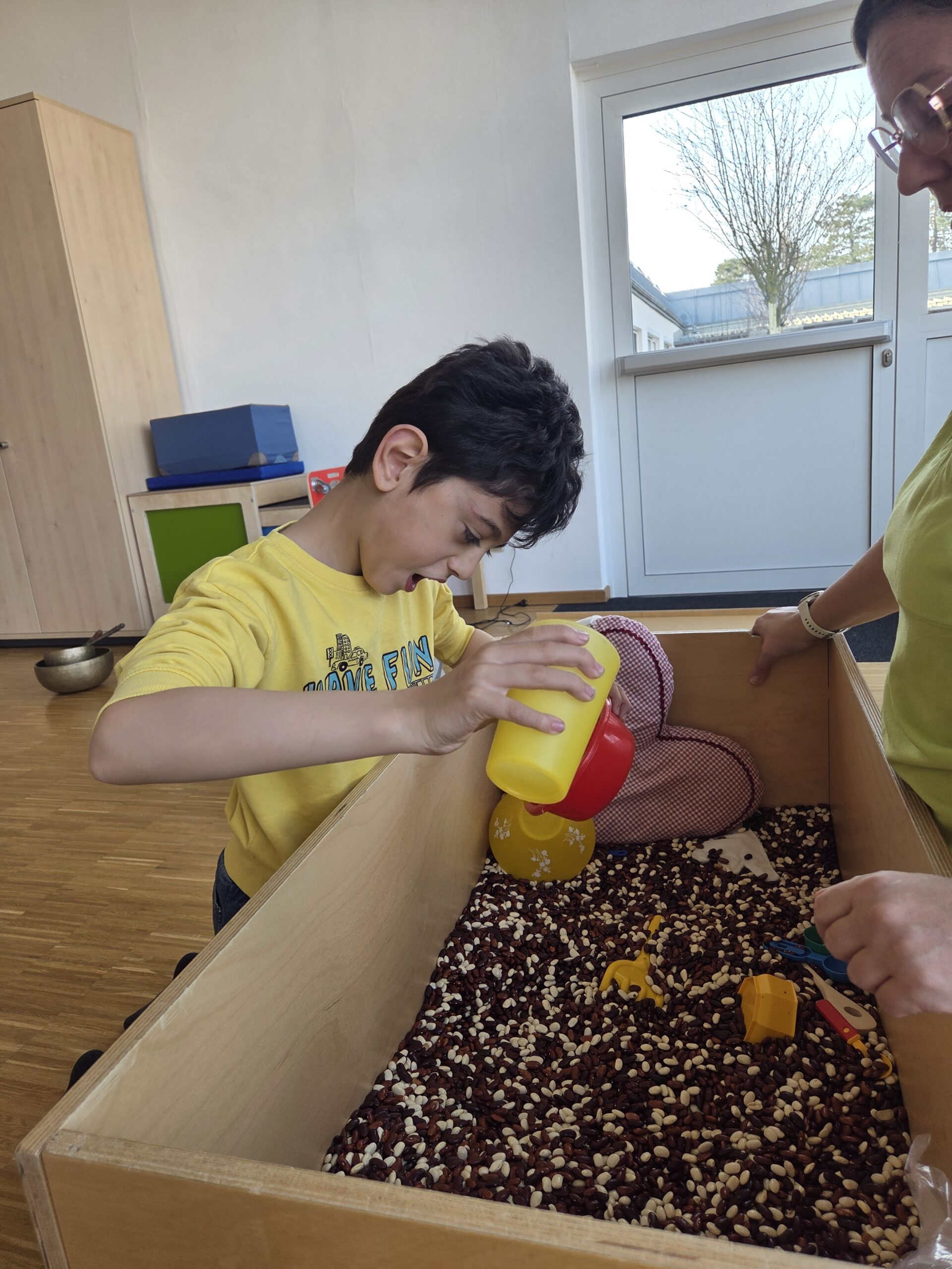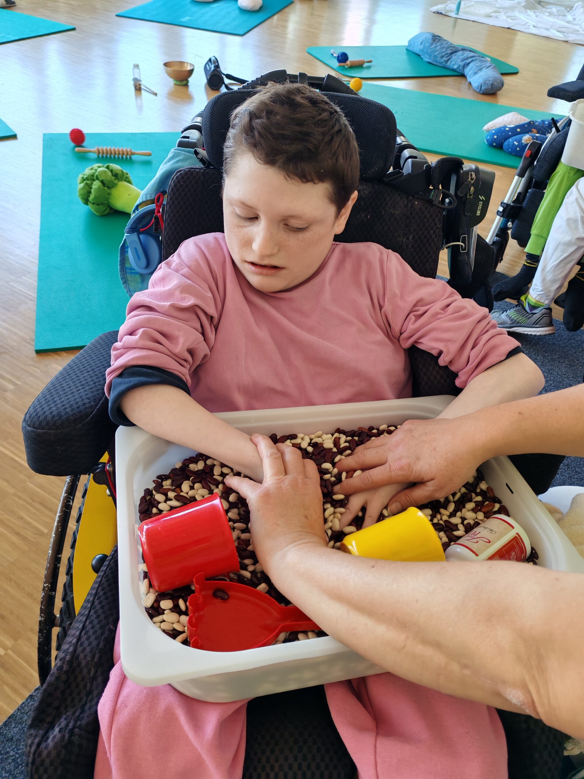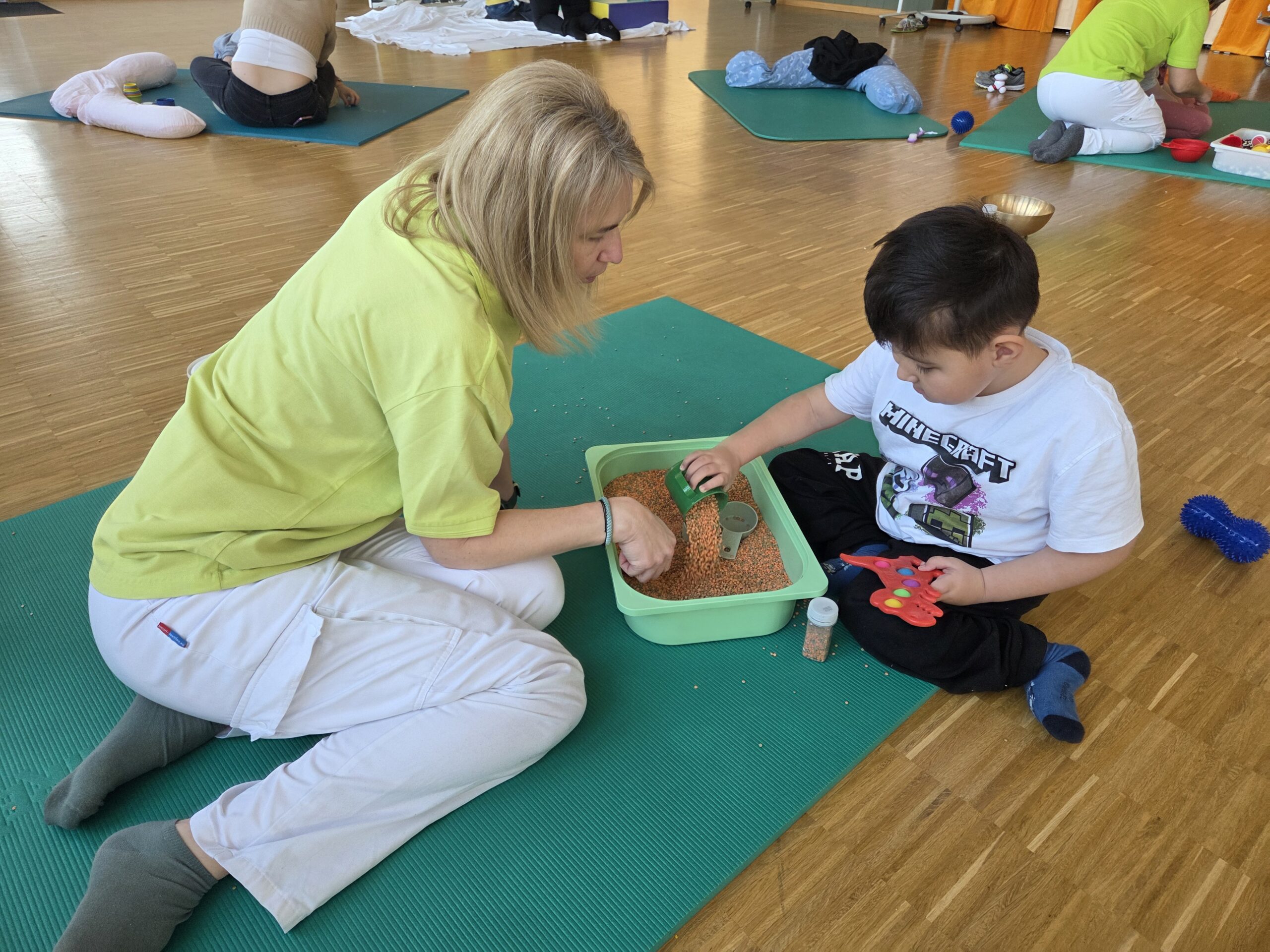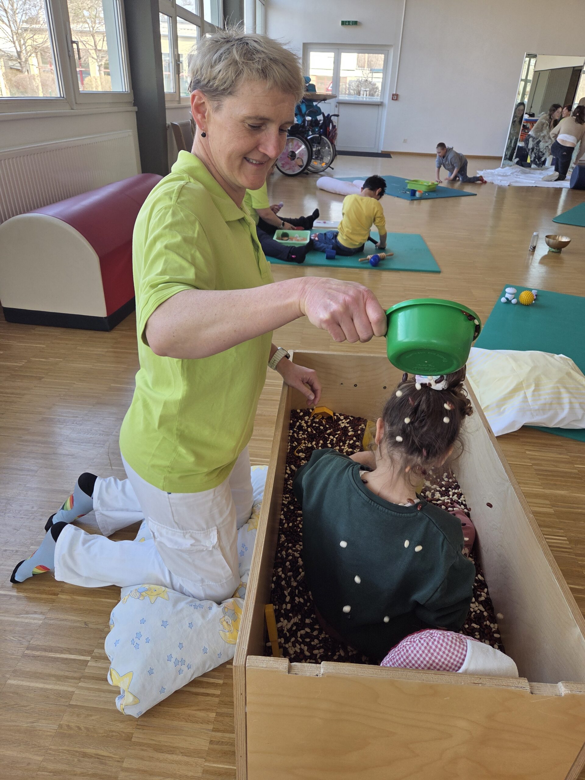 Nach einer kurzen Phase zur Tonusregulation – mit Abdrücken und Ausstreichen des Körpers sowie verschiedenen Materialien wie Igelball, Holzrolle oder Vibrationsmassagegerät – starteten die Kinder in den Stationenbetrieb. Hier konnten sie unterschiedliche Materialien entdecken und mit den Händen erforschen: Rasierschaum am Spiegel, Bohnen- und Linsenbäder oder weiche Wasserperlen boten vielfältige Sinneseindrücke und luden zum Experimentieren ein.