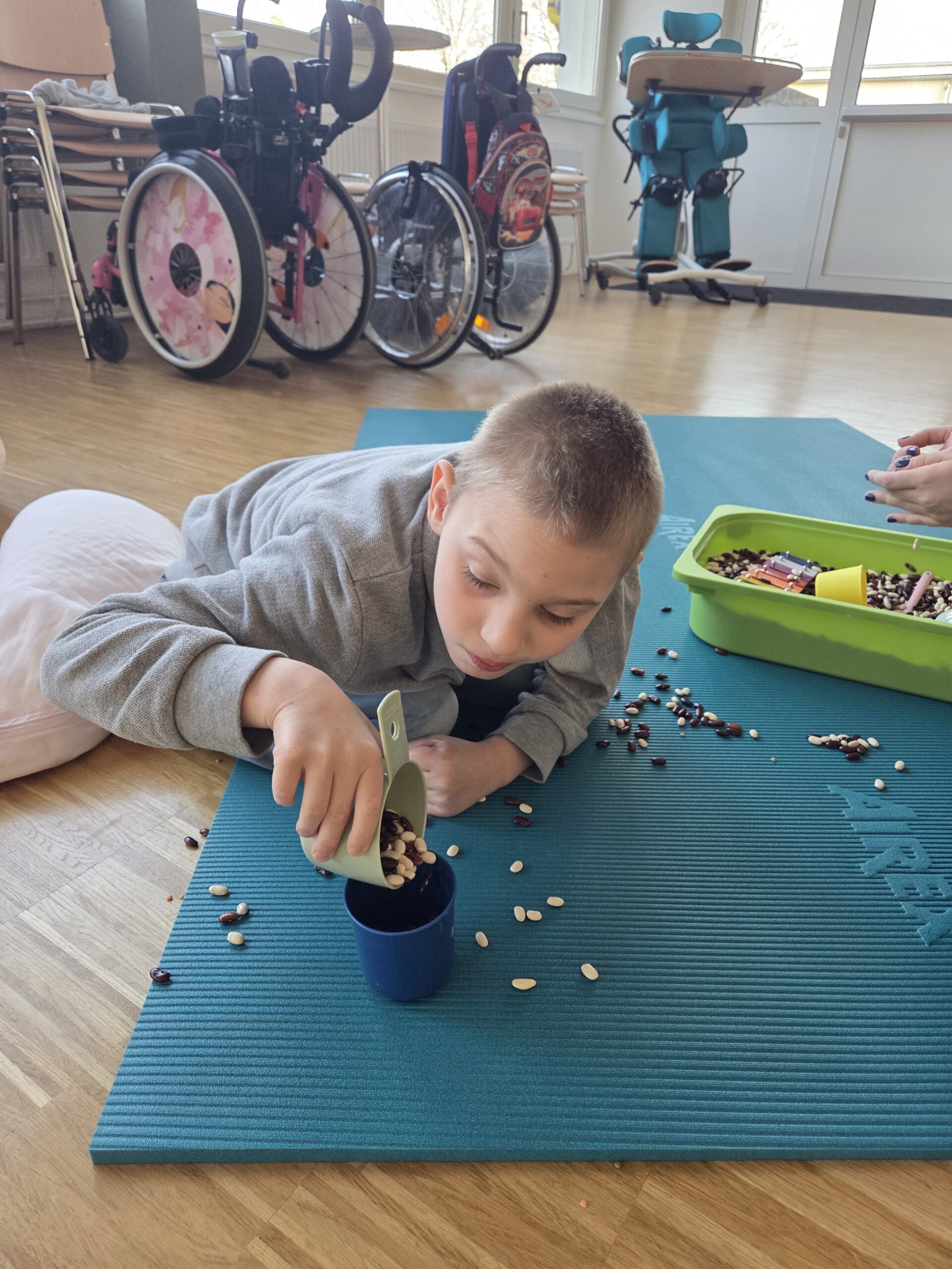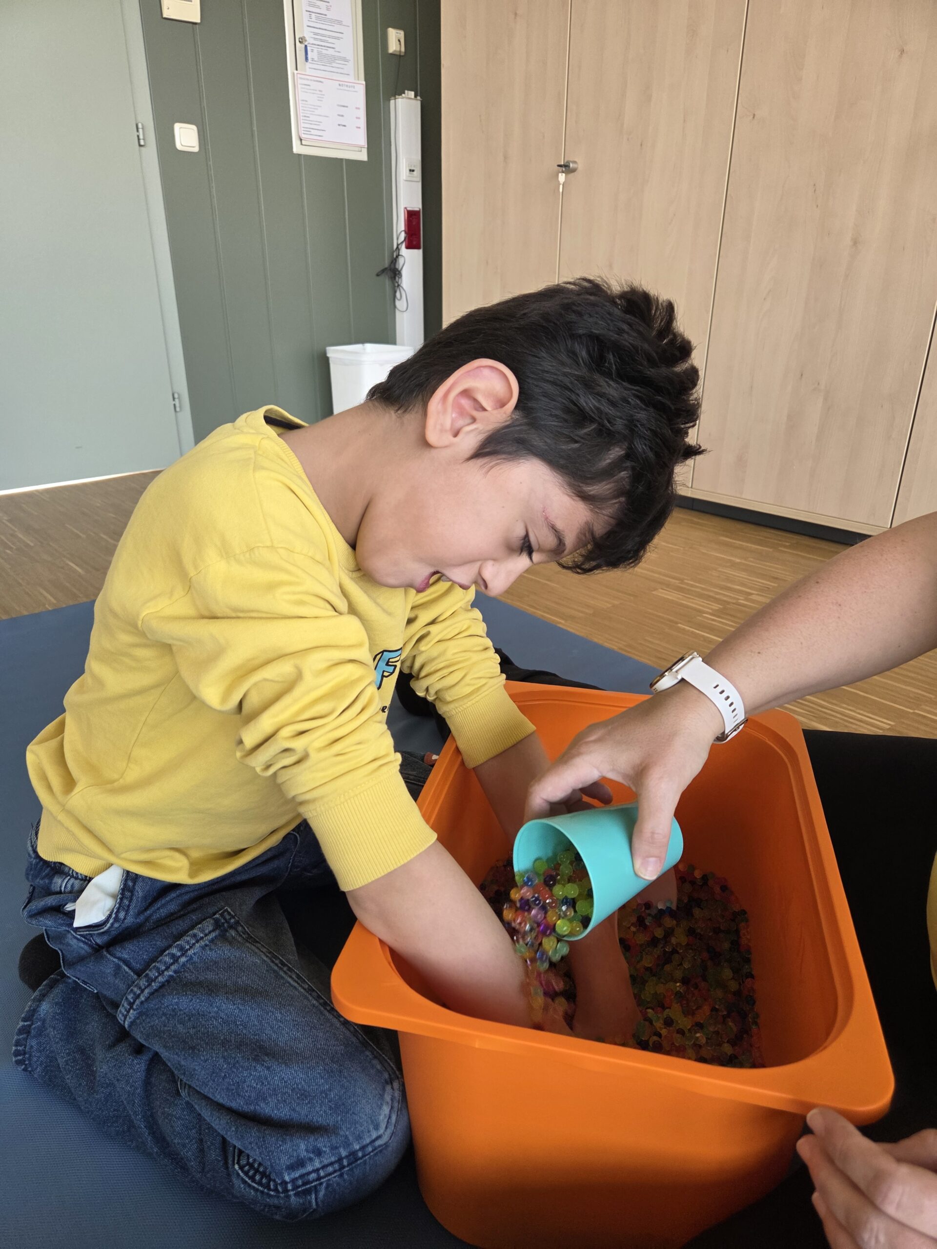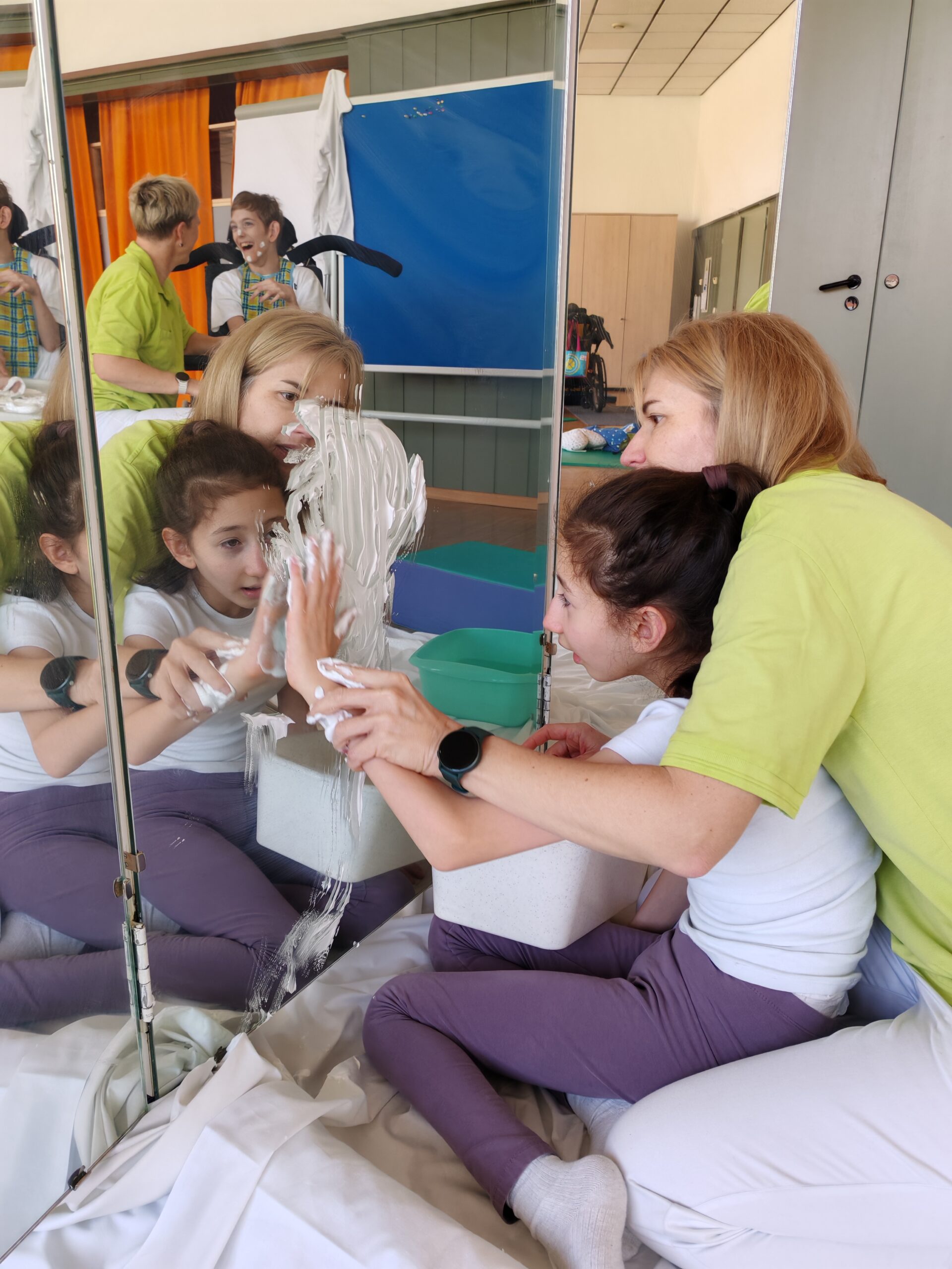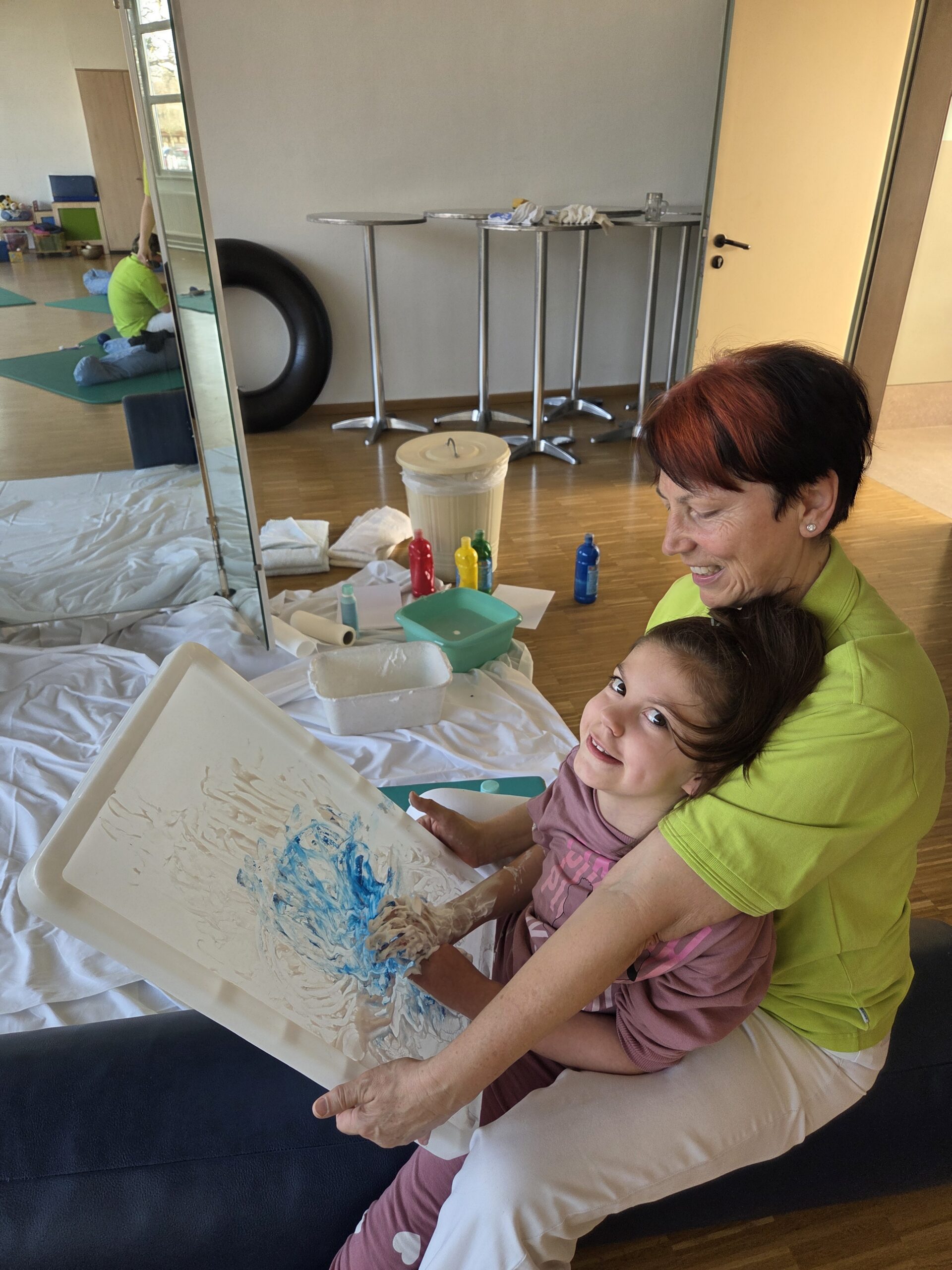 Nach einer kurzen Phase zur Tonusregulation – mit Abdrücken und Ausstreichen des Körpers sowie verschiedenen Materialien wie Igelball, Holzrolle oder Vibrationsmassagegerät – starteten die Kinder in den Stationenbetrieb. Hier konnten sie unterschiedliche Materialien entdecken und mit den Händen erforschen: Rasierschaum am Spiegel, Bohnen- und Linsenbäder oder weiche Wasserperlen boten vielfältige Sinneseindrücke und luden zum Experimentieren ein.