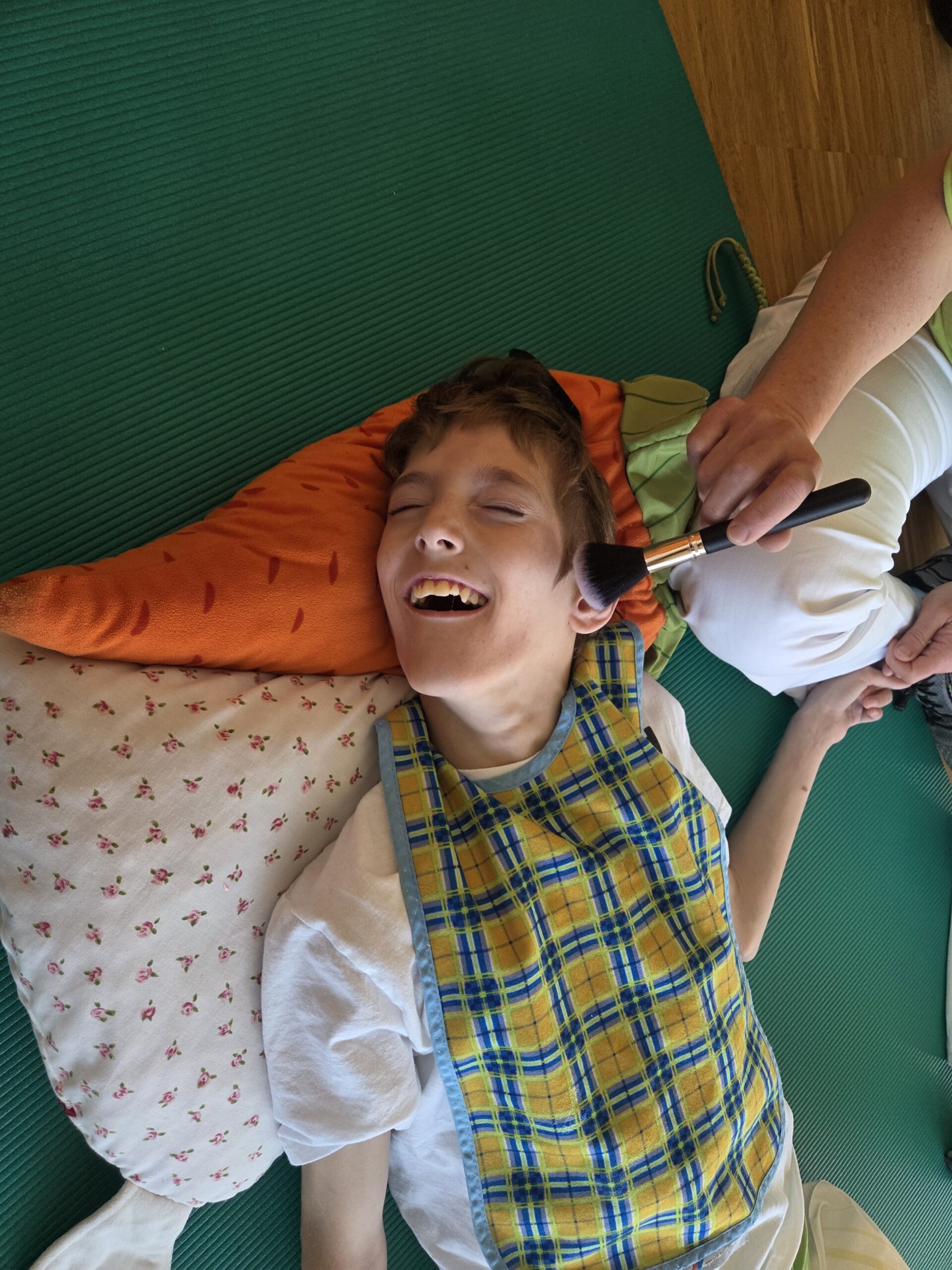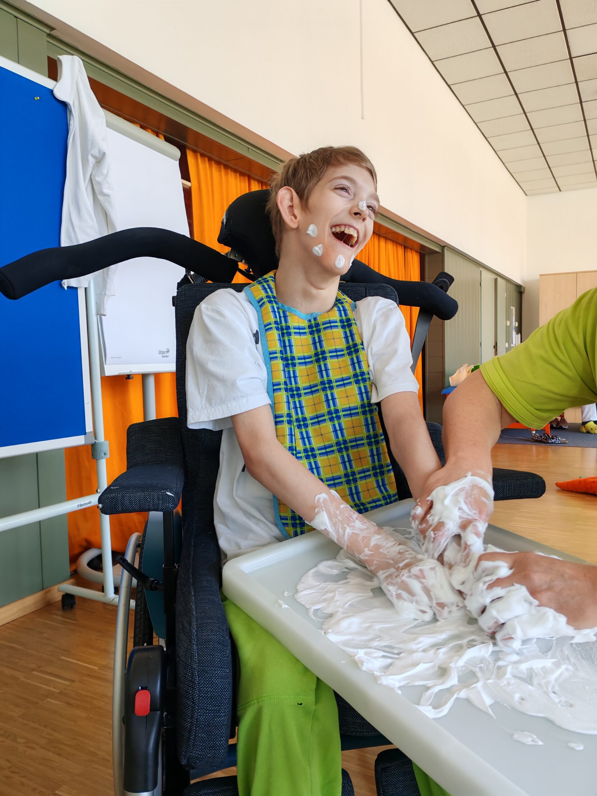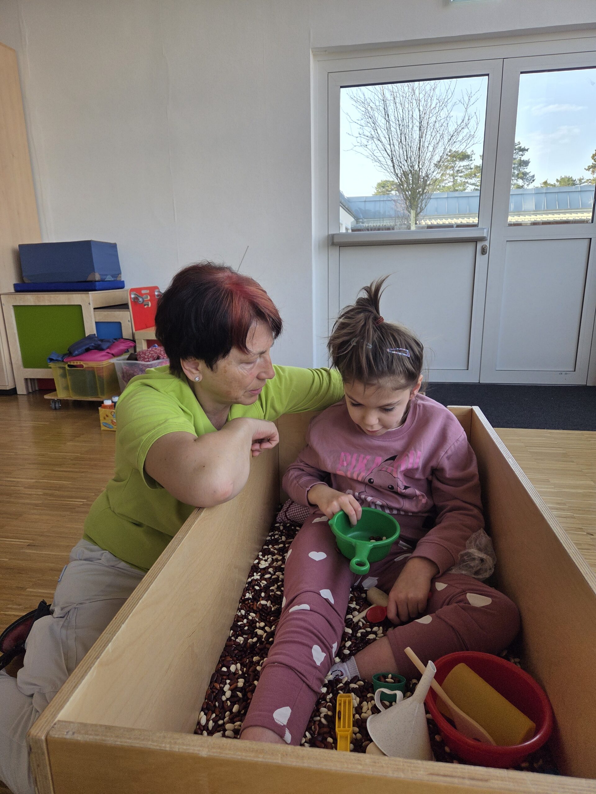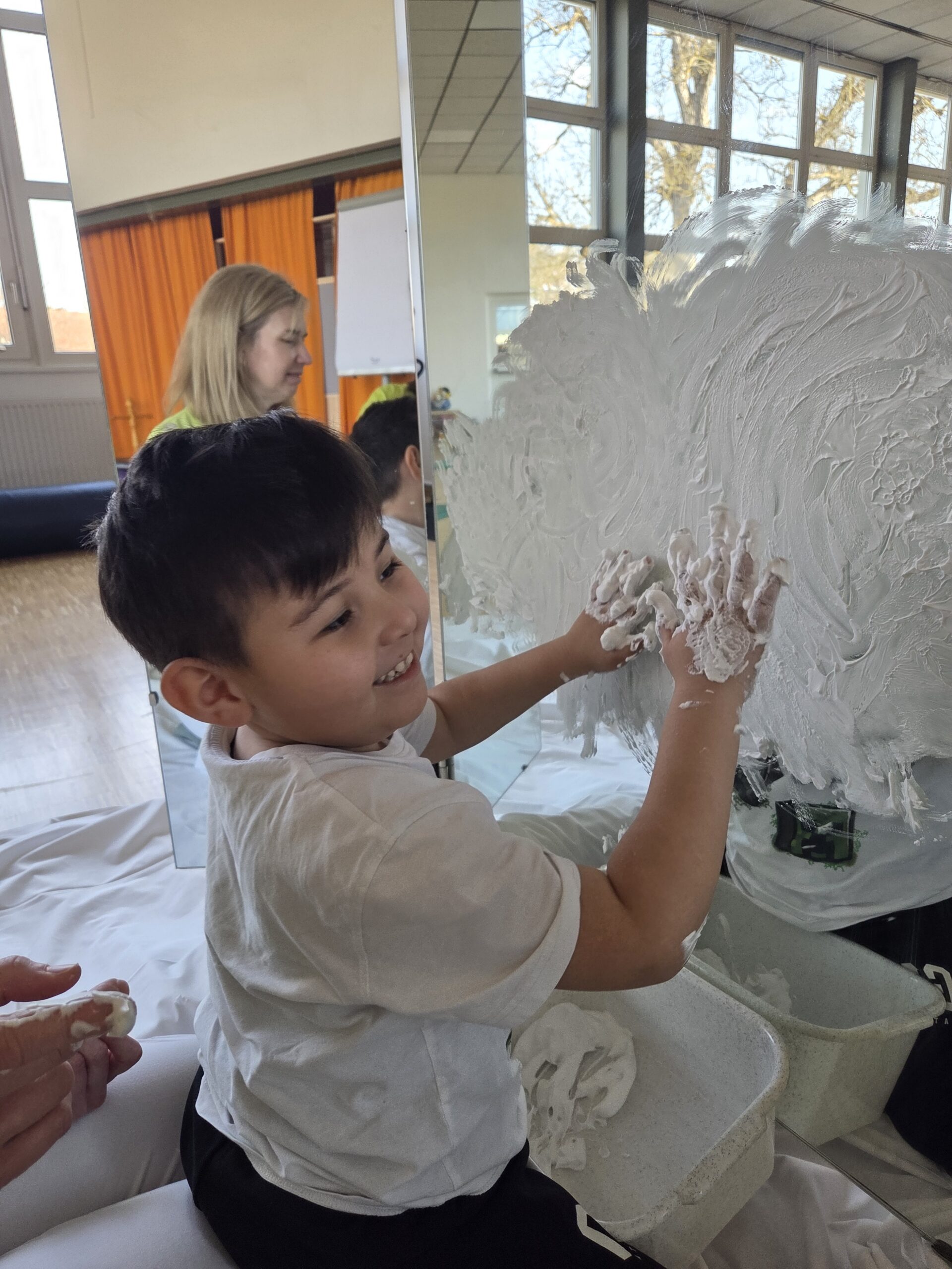 Nach einer kurzen Phase zur Tonusregulation – mit Abdrücken und Ausstreichen des Körpers sowie verschiedenen Materialien wie Igelball, Holzrolle oder Vibrationsmassagegerät – starteten die Kinder in den Stationenbetrieb. Hier konnten sie unterschiedliche Materialien entdecken und mit den Händen erforschen: Rasierschaum am Spiegel, Bohnen- und Linsenbäder oder weiche Wasserperlen boten vielfältige Sinneseindrücke und luden zum Experimentieren ein.