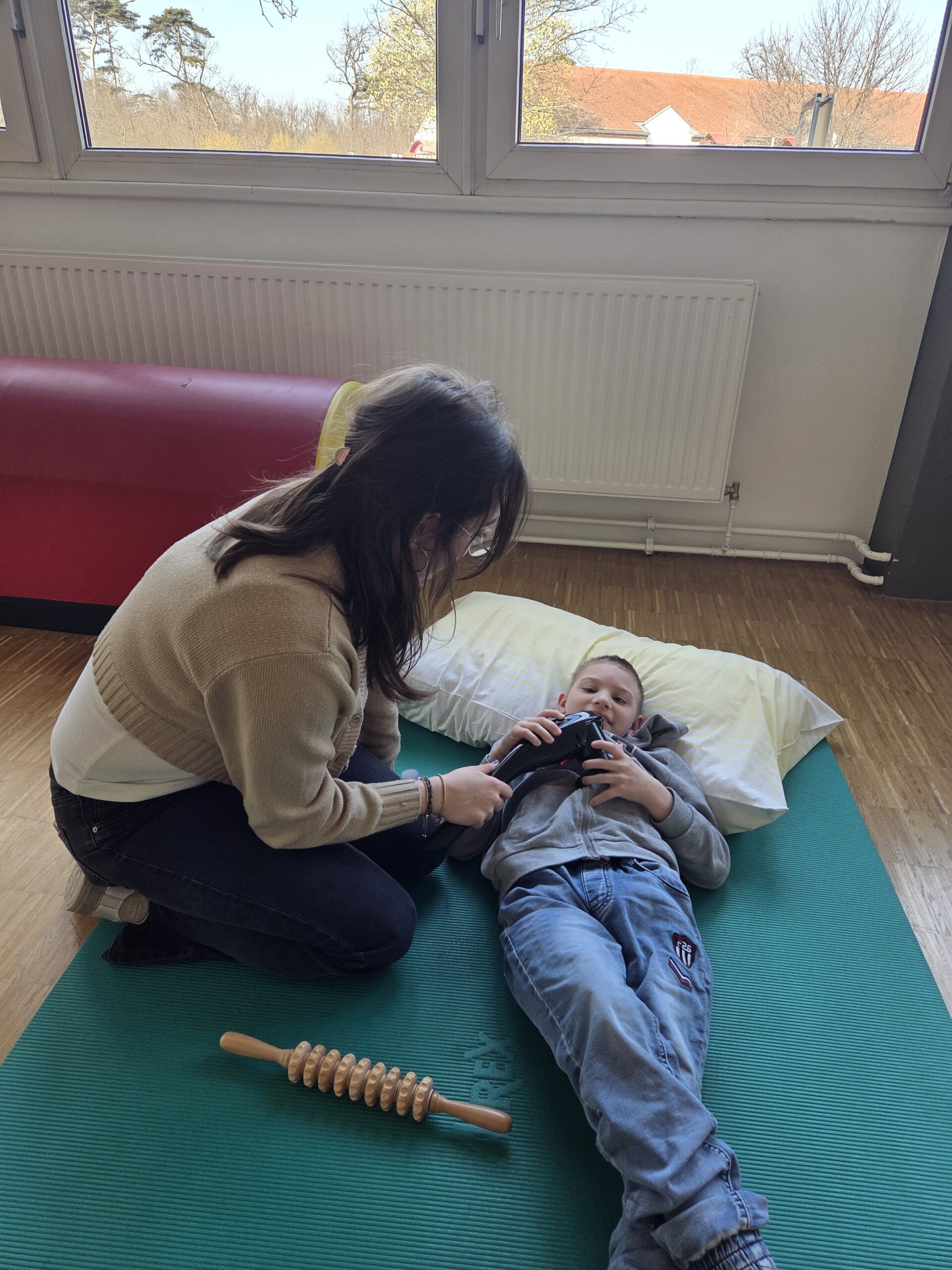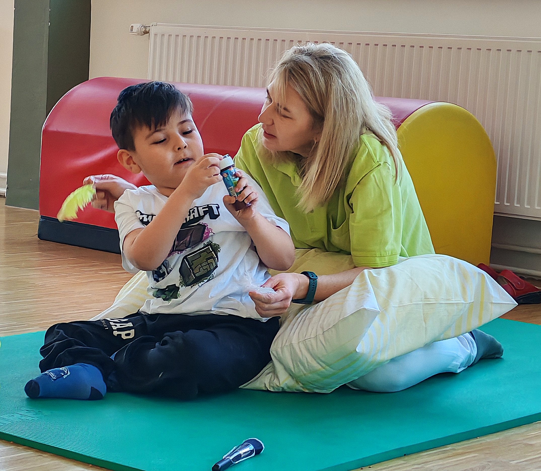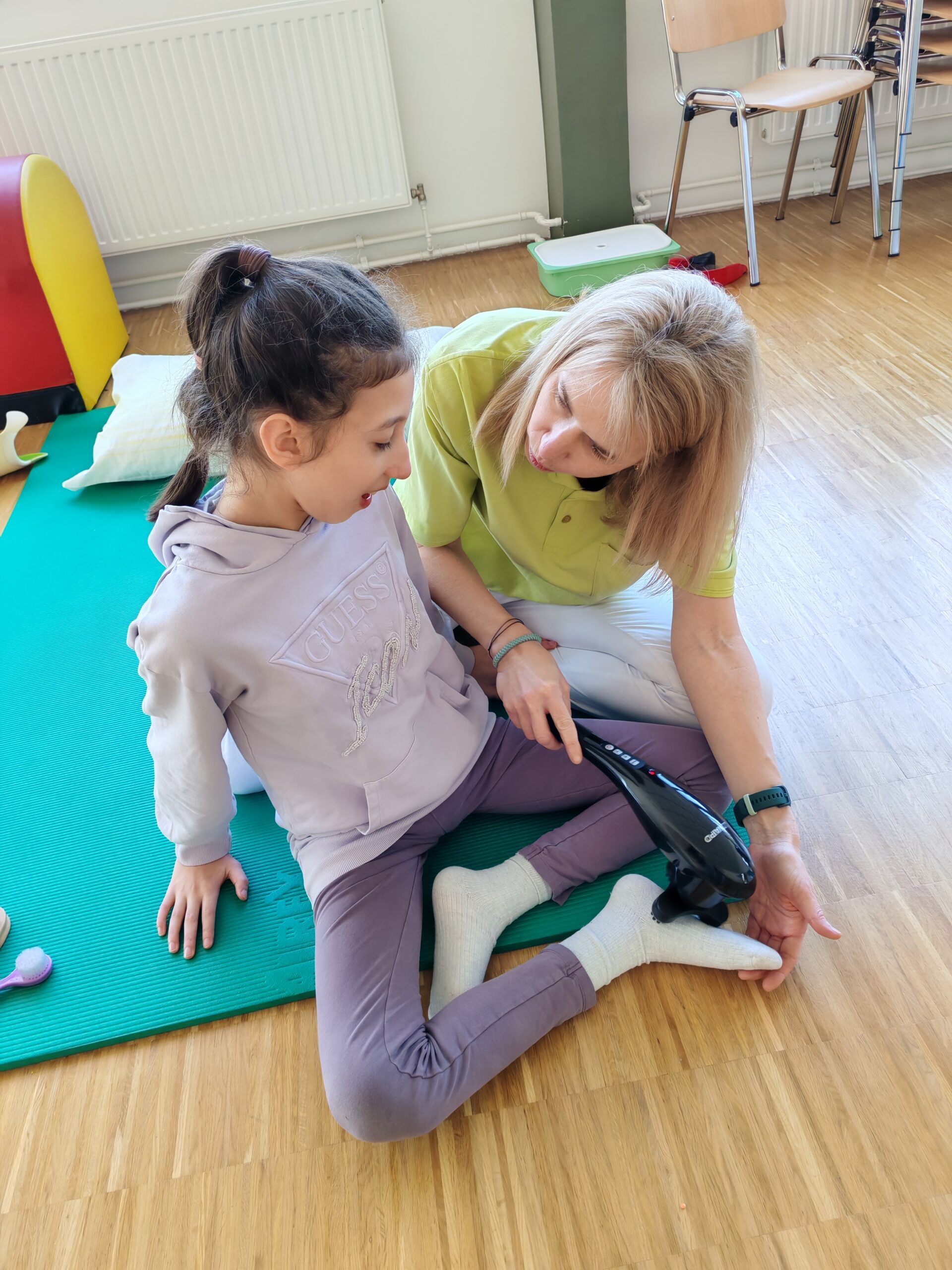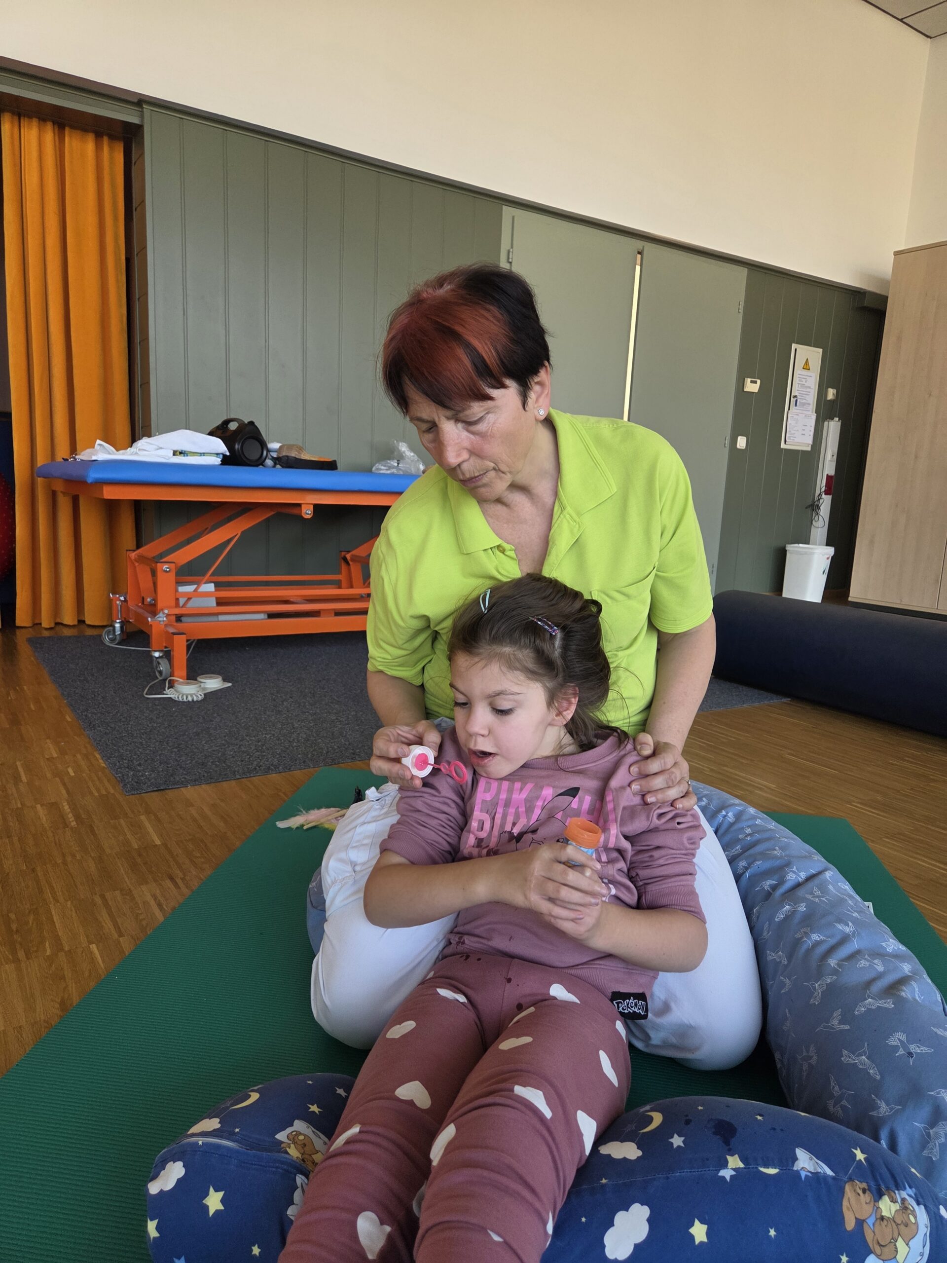 Nach einer kurzen Phase zur Tonusregulation – mit Abdrücken und Ausstreichen des Körpers sowie verschiedenen Materialien wie Igelball, Holzrolle oder Vibrationsmassagegerät – starteten die Kinder in den Stationenbetrieb. Hier konnten sie unterschiedliche Materialien entdecken und mit den Händen erforschen: Rasierschaum am Spiegel, Bohnen- und Linsenbäder oder weiche Wasserperlen boten vielfältige Sinneseindrücke und luden zum Experimentieren ein.