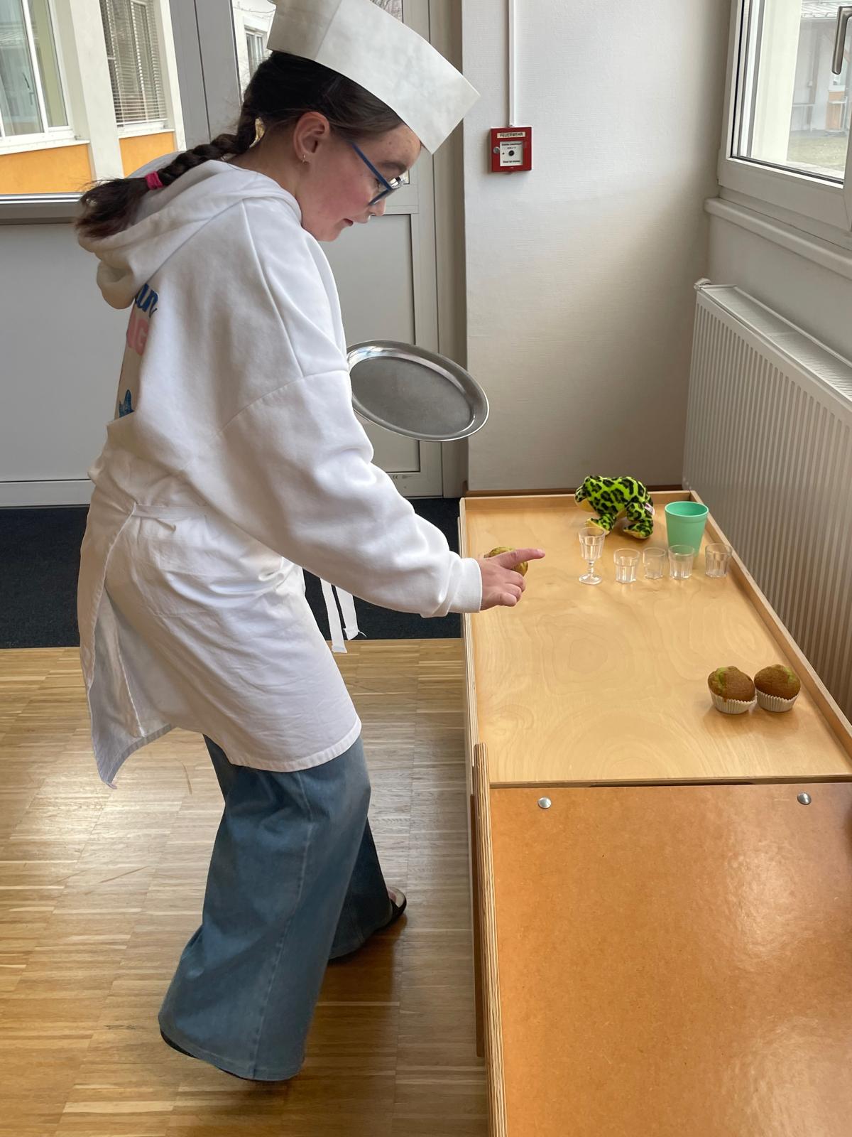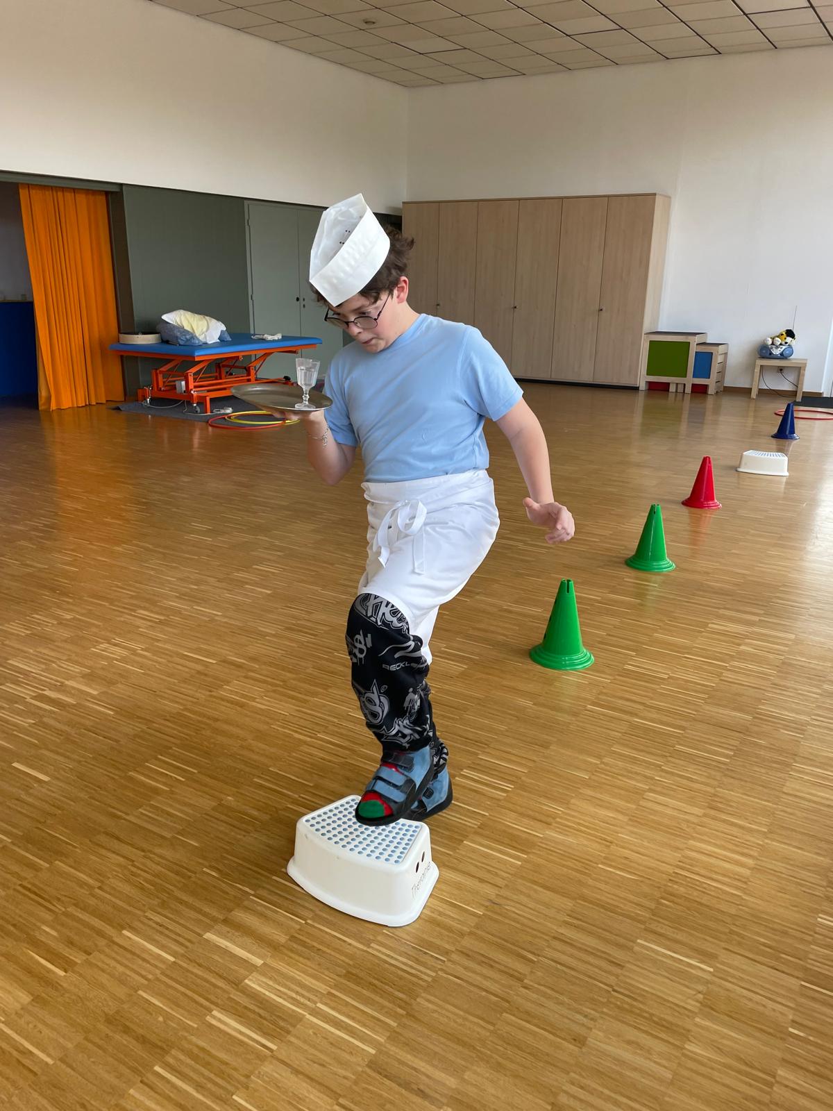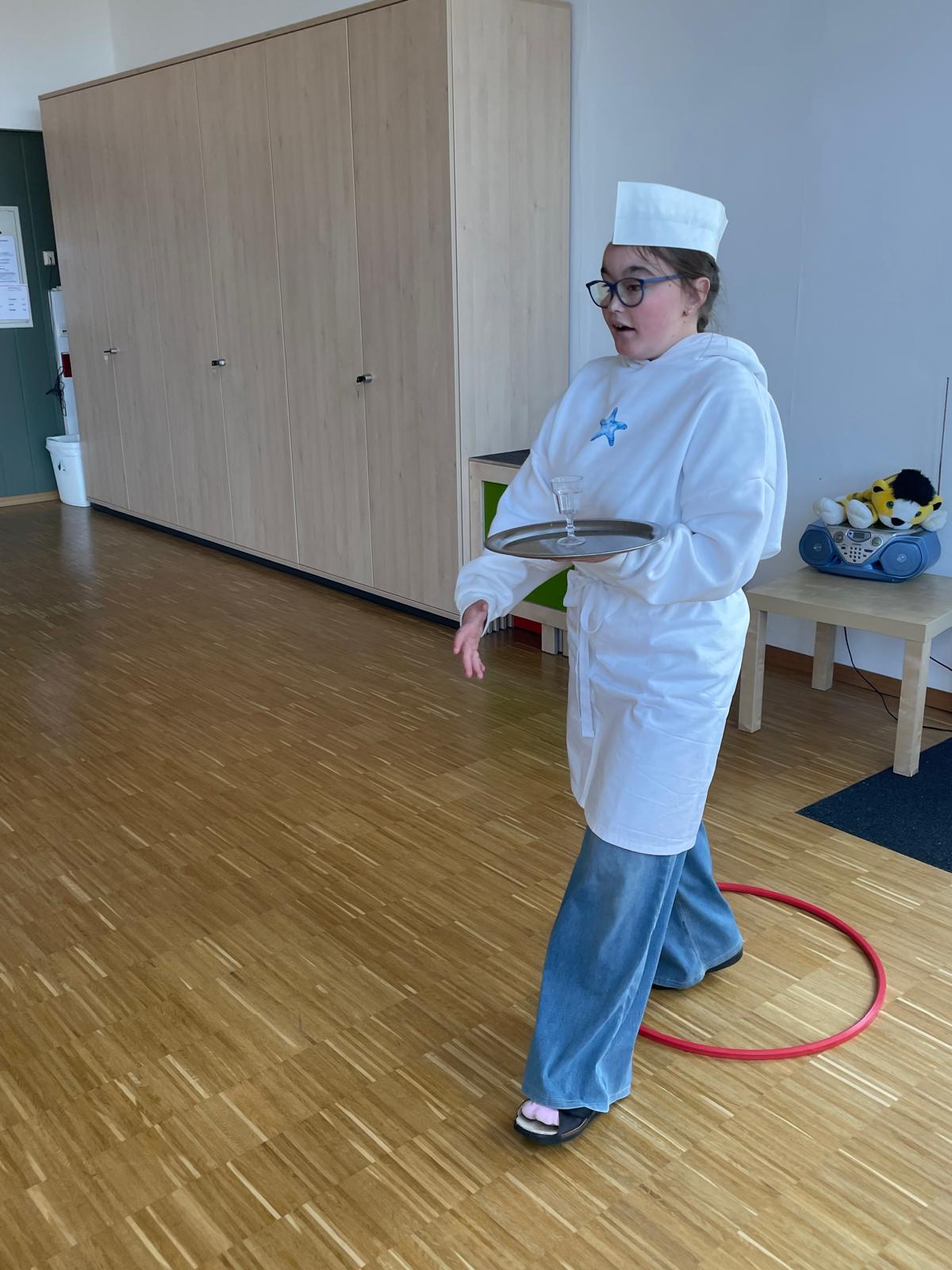 Ein besonderes Highlight war das „königliche Servieren“: Die Kinder trugen kleine Tabletts mit Bechern und Muffins durch einen Parcours. Dabei übten sie Gleichgewicht, Koordination und Konzentration. Mit viel Spaß und Bewegung wurde so spielerisch die Fein- und Grobmotorik geschult – ganz im Stil eines echten Königshofes.